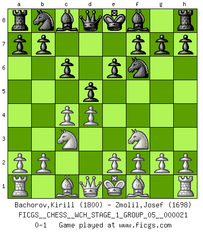 Last move : 0-1 2019 September 1 9:28:19 [Event "FICGS__CHESS__WCH_STAGE_1_GROUP_05__000021"] [Site "FICGS"] [Date "2019.07.01"] [Round "1"] [White "Bachorov,Kirill"] [Black "Zmolil,Josef"] [Result "0-1"] [WhiteElo "1800"] [BlackElo "1698"] 1.d4 d5 2.c4 e6 3.Nf3 Nf6 4.Nc3 c6 0-1 This chess game has been lost on time (started : 2019.07.01 23:47:47) Queen's gambit declined Player Black won this chess game. Follow this game move after move (download)Tactics flow from a superior position. (Bobby Fischer) Glücklicherweise sind Großmeister Ruben Fines reine Schachbücher weniger phallozentrisch [als seine Schachpsychologie] und deswegen auch weniger lächerlich. (Nigel Short) Si yo gano un torneo, yo lo gano por mí mismo. Yo hago las jugadas. Nadie me ayuda. (Bobby Fischer) La victoire dans une partie d'Echecs appartient la plupart du temps à celui qui voit un peu plus loin que l'adversaire. (Lasker) A good book on your shelf is a friend that turns its back on you and remains a friend. (Author unknown)