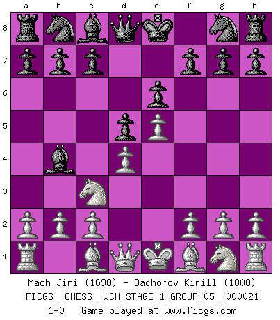 Last move : 1-0 2019 August 31 20:55:49 [Event "FICGS__CHESS__WCH_STAGE_1_GROUP_05__000021"] [Site "FICGS"] [Date "2019.07.01"] [Round "1"] [White "Mach,Jiri"] [Black "Bachorov,Kirill"] [Result "1-0"] [WhiteElo "1690"] [BlackElo "1800"] 1.e4 e6 2.d4 d5 3.Nc3 Bb4 4.e5 1-0 This chess game has been lost on time (started : 2019.07.01 23:47:47) French : Winawer, Advance variation Player White won this chess game. Follow this game move after move (download)Who is your opponent tonight, tonight I am playing against the Black pieces. (Akiba Rubinstein) Im Internet Chess Club betrug mein Rating vorübergehend 3350 ELO-Punkte. (Sergej Karjakin) Para mi, el Ajedrez es la vida y cada partida es como una nueva vida. Todo jugador de Ajedrez suele vivir muchas vidas durante su vida. (Eduard Gufeld) Le jeu d'échecs fait naître et fortifie en nous plusieurs qualités précieuses dans le cours de l'existence, telles que la prévoyance, la circonspection, la prudence, et la persévérance. (Benjamin Franklin - 1783, la morale des échecs) No, I am still playing. (Anatoly Karpov)
