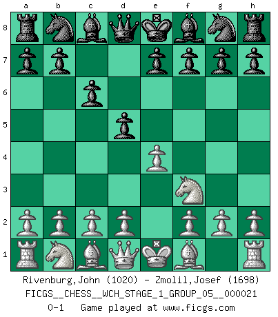 Last move : 0-1 2019 August 10 21:45:52 [Event "FICGS__CHESS__WCH_STAGE_1_GROUP_05__000021"] [Site "FICGS"] [Date "2019.07.01"] [Round "1"] [White "Rivenburg,John"] [Black "Zmolil,Josef"] [Result "0-1"] [WhiteElo "1020"] [BlackElo "1698"] 1.e4 c6 2.Nf3 d5 0-1 This chess game has been lost on time (started : 2019.07.01 23:47:47) Caro-Kann defense Player Black won this chess game. Follow this game move after move (download)When the Chess game is over, the Pawn and the King go back to the same box. (Irish saying) Ja, jede Frau in Holland liebt mich bestimmt, und alle Männer hassen mich. (Loek van Wely) Debió haber existido una vez en que los hombres eran semidióses, de otra manera no hubiesen podido inventar el Ajedrez. (Gustav Schenk) Mais n'est-ce pas déjà le limiter injurieusement que d'appeler les échecs un jeu? N'est-ce pas aussi une science, un art, ou quelque chose qui, comme le cercueil de Mahomet entre ciel et terre, est suspendu entre l'un et l'autre, et qui réunit un nombre incroyable de contraires ? (Stefan Zweig) If only faces could talk... (Pat Summerall, Sportscaster during the Super Bowl)