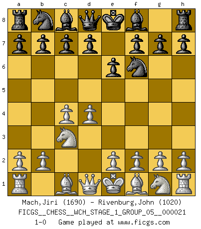 Last move : 1-0 2019 August 15 16:2:57 [Event "FICGS__CHESS__WCH_STAGE_1_GROUP_05__000021"] [Site "FICGS"] [Date "2019.07.01"] [Round "1"] [White "Mach,Jiri"] [Black "Rivenburg,John"] [Result "1-0"] [WhiteElo "1690"] [BlackElo "1020"] 1.d4 Nf6 2.c4 e6 3.Nc3 1-0 This chess game has been lost on time (started : 2019.07.01 23:47:47) Queen's pawn game Player White won this chess game. Follow this game move after move (download)Life is like a game of Chess, changing with each move. (Chinese proverb) Darum geht es im Schach. Einen Tag gibst du deinem Gegner eine Lektion, am nächsten Tag gibt er dir eine. (Robert James Fischer) El Ajedrez es una guerra en un tablero. El objetivo es aplastar la mente del oponente. (Bobby Fischer) Que feriez-vous si vous étiez en train de jouer aux échecs et que la fin du monde arrive ? Je continuerais à jouer. (Saint Borromée) Depression is just anger without enthusiasm. (Unknown)