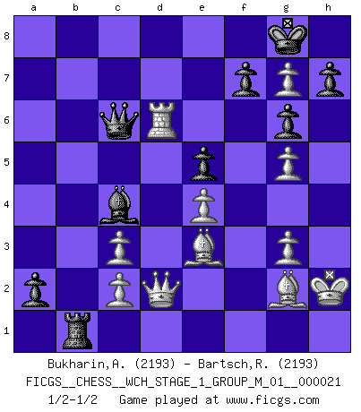 Last move : 1/2-1/2 2019 November 8 15:32:7 [Event "FICGS__CHESS__WCH_STAGE_1_GROUP_M_01__000021"] [Site "FICGS"] [Date "2019.07.01"] [Round "1"] [White "Bukharin,Alexey"] [Black "Bartsch,Reinhard Andrea"] [Result "1/2-1/2"] [WhiteElo "2193"] [BlackElo "2193"] 1.e4 c5 2.Nf3 d6 3.d4 cxd4 4.Nxd4 Nf6 5.Nc3 a6 6.Nb3 Nbd7 7.a4 b6 8.g4 Bb7 9.Bg2 g6 10.O-O Rb8 11.f4 Bg7 12.Be3 Nc5 13.Bd4 Ne6 14.g5 Nh5 15.Be3 O-O 16.f5 Bxc3 17.bxc3 Neg7 18.Nd4 Re8 19.Rb1 Qc7 20.Qd3 e5 21.Ne2 a5 22.Bxb6 Qc8 23.Ba7 Ra8 24.Be3 Ba6 25.Qd2 Bc4 26.Bf3 Qd7 27.Rf2 Qxa4 28.Ng3 Nxg3 29.hxg3 Qc6 30.f6 Reb8 31.Rxb8+ Rxb8 32.fxg7 Rb1+ 33.Kh2 a4 34.Bg2 a3 35.Rf6 a2 36.Rxd6 Qc7 37.Rd7 Qc6 38.Rd6 Qc7 39.Rd7 Qc6 40.Rd6 1/2-1/2 Sicilian : Najdorf Kingside Castling by player White (move 10) Kingside Castling by player Black (move 15) This chess game ended in a draw. Follow this game move after move (download)Fischer sacrificed virtually everything most of us weakies (to use his term) value, respect, and cherish, for the sake of an artful, often beautiful board game, for the ambivalent privilege of being its greatest master. (Paul Kollar) Der Bart als Geschlechtszeichen mitten im Gesicht ist obszön. Daher gefällt er den Weibern. [Zugegeben, kein Schachzitat, aber unglaublich originell] (Arthur Schopenhauer) El juego de Damas es para vagabundos. (Paul Morphy) Avec des compensations pour le matériel en plus... (Anonyme) Being number two sucks. (Andre Agassi)