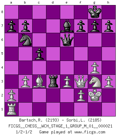 Last move : 1/2-1/2 2019 September 17 9:3:5 [Event "FICGS__CHESS__WCH_STAGE_1_GROUP_M_01__000021"] [Site "FICGS"] [Date "2019.07.01"] [Round "1"] [White "Bartsch,Reinhard Andrea"] [Black "Sorbi,Luca"] [Result "1/2-1/2"] [WhiteElo "2193"] [BlackElo "2185"] 1.c4 e5 2.g3 Nf6 3.Bg2 d5 4.cxd5 Nxd5 5.Nf3 Nc6 6.Nc3 Nb6 7.d3 Be7 8.O-O O-O 9.Be3 Be6 10.d4 exd4 11.Nxd4 Nxd4 12.Bxd4 c6 13.Ne4 Bd5 14.e3 Qc8 15.Qc2 Qe6 16.Rfd1 Rfe8 17.b3 Qg6 18.Qd3 Qh5 19.h3 Rad8 20.g4 Qh6 21.Qc2 Qg6 22.Qb1 Qe6 23.Ng3 Bxg2 24.Kxg2 c5 25.Bb2 Rxd1 26.Qxd1 Rd8 27.Qf3 Rd2 28.Bc3 Rd3 1/2-1/2 English Opening Kingside Castling by player White (move 8) Kingside Castling by player Black (move 8) This chess game ended in a draw. Follow this game move after move (download)Blessed be the memory of him who gave the world this immortal game. (A. G. Gardiner) Es ist nicht das erste mal, dass sich die FIDE dem Arabischen Geld gebeugt hat (über die FIDE WM 2004 in Lybien). (Larry Evans) Las ideas audaces son como las piezas del Ajedrez que avanzan hacia adelante. Ellas pueden ser vencidas, pero también pueden iniciar una partida victoriosa. (Goethe) Il a essayé de se convaincre qu'il pourrait empêcher toutes les erreurs et ne jamais perdre. L'horreur ! Gary Kasparov au sujet de Robert Fischer. Warrior pose battles inner weakness and wins focus. You see that there is no war within you. You're on your own side, and you are your own strength. (Terri Guillemets)