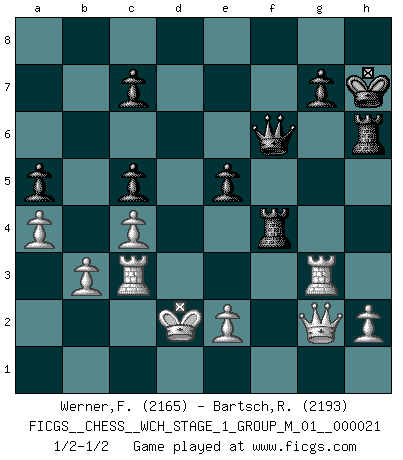 Last move : 1/2-1/2 2019 October 13 17:21:5 [Event "FICGS__CHESS__WCH_STAGE_1_GROUP_M_01__000021"] [Site "FICGS"] [Date "2019.07.01"] [Round "1"] [White "Werner,Frank-Karl"] [Black "Bartsch,Reinhard Andrea"] [Result "1/2-1/2"] [WhiteElo "2165"] [BlackElo "2193"] 1.d4 Nf6 2.Nf3 d5 3.c4 e6 4.g3 Bb4+ 5.Bd2 Be7 6.Bg2 O-O 7.O-O Nbd7 8.a4 a5 9.Qc2 b6 10.Ne5 Nxe5 11.dxe5 Ne4 12.Bxe4 dxe4 13.Qxe4 Rb8 14.Be3 Bb4 15.Qc2 f5 16.exf6 Qxf6 17.Nd2 e5 18.Ne4 Qg6 19.f3 Bf5 20.Rac1 h6 21.Rfd1 Bc5 22.Bxc5 bxc5 23.b3 h5 24.Qd3 Bxe4 25.fxe4 Rf4 26.Rc3 h4 27.Rf1 Rxe4 28.Rf2 Kh7 29.Kf1 Rb6 30.Rf3 hxg3 31.Rxg3 Rf6+ 32.Ke1 Qf5 33.Rh3+ Kg6 34.Rg3+ Kh7 35.Rf3 Qg4 36.Rh3+ Rh6 37.Rg3 Qf4 38.Rh3 Qg4 39.Rg3 Qh4 40.Qf3 Rf4 41.Qg2 Qf6 42.Kd2 1/2-1/2 Queen's pawn game Kingside Castling by player Black (move 6) Kingside Castling by player White (move 7) This chess game ended in a draw. Follow this game move after move (download)Modern Chess is too much concerned with things like Pawn structure. Forget it, Checkmate ends the game. (Nigel Short) Schachspieler können ausgezeichnet Varianten am Schachbrett berechnen, aber nicht im realen Leben. Zu stark ist der Individualismus im Schach ausgeprägt, und für viele ist ein kleiner momentaner persönlicher Vorteil wichtiger als ein weit größerer Vorteil von morgen. (Anatoly Karpov) El Ajedrez era la lengua materna de Capablanca. (Reti) Donnez-moi un Cavalier en 6e et je gagnerais toutes mes parties. (Steinitz) Nobody is always a winner, and anybody who says he is, is either a liar or doesn't play poker. (Amarillo Slim)