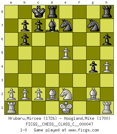 Last move : 1-0 2008 January 2 10:19:27 [Event "FICGS__CHESS__CLASS_C__000047"] [Site "FICGS"] [Date "2007.06.16"] [Round "1"] [White "Hrubaru,Mircea"] [Black "Hoogland,Mike"] [Result "1-0"] [WhiteElo "1726"] [BlackElo "1700"] 1.e4 e5 2.f4 exf4 3.Nf3 d6 4.d4 g5 5.h4 g4 6.Ng1 Qf6 7.Nc3 Ne7 8.Nge2 Bh6 9.Qd2 Bd7 10.g3 Nbc6 11.gxf4 O-O-O 12.Bg2 Bg7 13.e5 Qh6 14.Ne4 Nf5 15.Qd3 Nce7 16.Bd2 dxe5 17.fxe5 Qb6 18.Qb3 h6 19.Qxb6 axb6 20.N4g3 f6 21.Nh5 fxe5 22.Nxg7 Nxg7 23.dxe5 1-0 This chess game has been lost on time (started : 2007.06.16 21:56:17) KGA : Fischer defense Queenside Castling by player Black (move 11) Player White won this chess game. Follow this game move after move (download)You need not play well - just help your opponent to play badly. (Genrikh Chepukaitis) Ich hatte meine größten Erfolge, als ich 47 Jahre alt war. Kasparow war noch nicht mal 42 und hat das Schach schon im Stich gelassen. (Viktor Kortschnoi) Los tropiezos estan todos ahí en el tablero, esperando que se cometan. (Savielly Tartakover) Le génie consiste à savoir transgresser les règles au moment opportun. (Teichmann) When a man with money meets a man with experience, the man with experience leaves with money and the man with money leaves with experience. (Anonymous)
