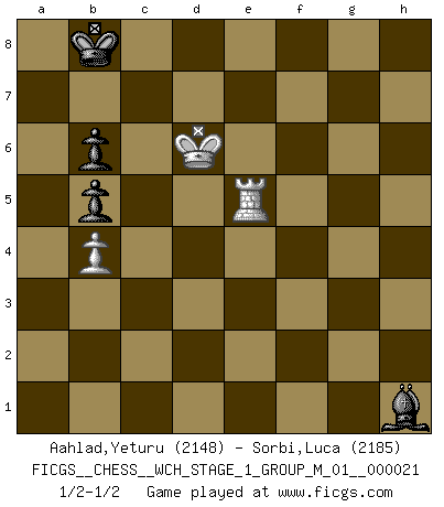 Last move : 1/2-1/2 2020 January 31 19:31:2 [Event "FICGS__CHESS__WCH_STAGE_1_GROUP_M_01__000021"] [Site "FICGS"] [Date "2019.07.01"] [Round "1"] [White "Aahlad,Yeturu"] [Black "Sorbi,Luca"] [Result "1/2-1/2"] [WhiteElo "2148"] [BlackElo "2185"] 1.e4 e5 2.Nf3 Nf6 3.Nxe5 d6 4.Nf3 Nxe4 5.d4 d5 6.Bd3 Nc6 7.O-O Be7 8.Nbd2 Nxd2 9.Bxd2 Bg4 10.c3 O-O 11.h3 Bh5 12.Re1 Bd6 13.g3 f5 14.Be2 f4 15.g4 Bg6 16.Qb3 Be4 17.c4 Qf6 18.cxd5 Nxd4 19.Nxd4 Qxd4 20.Bc3 Qb6 21.Bb5 a6 22.Bd7 Qxb3 23.Be6+ Kh8 24.axb3 Bc2 25.b4 Rad8 26.g5 Bg6 27.f3 Rde8 28.h4 Re7 29.Kf2 Rfe8 30.Rac1 Rd8 31.h5 Bxh5 32.Rh1 Bg6 33.Rh6 Rxe6 34.dxe6 Re8 35.R6h1 Rxe6 36.Rhe1 Re8 37.Rxe8+ Bxe8 38.Bd4 Bc6 39.Bc5 Be5 40.b3 h6 41.g6 Bf6 42.Kg2 Be8 43.Be7 Bxe7 44.Rxc7 Bf8 45.Rc8 Bxg6 46.Rxf8+ Kh7 47.Rxf4 Be8 48.Kf2 g5 49.Rf6 Bc6 50.Ke3 Kg7 51.Rd6 h5 52.f4 gxf4+ 53.Kxf4 h4 54.Kg4 Kf7 55.Kxh4 Ke7 56.Rd3 Ke6 57.Kg3 Bb5 58.Rd2 Bc6 59.Kf4 Bd5 60.Rd3 Bc6 61.Ke3 Ke5 62.Kd2 Bb5 63.Rd8 Ke6 64.Rd4 Bc6 65.Kc3 Bb5 66.Rd2 Ke7 67.Kd4 Kd6 68.Rh2 Bc6 69.Rh7 b6 70.Rh6+ Kc7 71.Ke5 Bf3 72.Rh3 Bc6 73.Rh7+ Kc8 74.Kd6 Be4 75.Rh4 Bg2 76.Rg4 Bh1 77.Rh4 Bg2 78.Rh8+ Kb7 79.Rg8 Bf3 80.Rg3 Bh1 81.Rg7+ Kb8 82.b5 axb5 83.b4 Be4 84.Re7 Bg2 85.Re5 Bh1 1/2-1/2 Petrov : Classical attack Kingside Castling by player White (move 7) Kingside Castling by player Black (move 10) 10 pieces endgame at move 52 : White KRPP , Black KBPPPP WHITE : King + 1 Rook 2 Pawns BLACK : King + 1 Bishop 4 Pawns 9 pieces endgame at move 53 : White KRPP , Black KBPPP WHITE : King + 1 Rook 2 Pawns BLACK : King + 1 Bishop 3 Pawns 8 pieces endgame at move 55 : White KRPP , Black KBPP WHITE : King + 1 Rook 2 Pawns BLACK : King + 1 Bishop 2 Pawns 7 pieces endgame at move 82 : White KRP , Black KBPP WHITE : King + 1 Rook 1 Pawn BLACK : King + 1 Bishop 2 Pawns This chess game ended in a draw. Follow this game move after move (download)All my games are real. (Bobby Fischer) Ein Springer auf f6 gegen die eigene Rochadestellung ist schlimmer als ein rostiger Nagel im Knie. (Efim Bogoljubov) El Ajedrez es una guerra en un tablero. El objetivo es aplastar la mente del oponente. (Bobby Fischer) Nous sommes les pions de la mystérieuse partie d'Echecs jouée par Dieu. Il nous déplace, nous arrête, nous pousse encore, puis nous lance un à un dans la boîte du Néant. Epitaphe sur la tombe de David Janowsky (1868-1927). Hello Thibault, if I have had a plan (and I had one, I hope), I have forgotten it during the last week... - Hello Heinz-Georg. What do you mean a plan ? (Anonymous players, during a Big Chess game)
