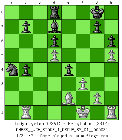 Last move : 1/2-1/2 2019 August 22 15:20:10 [Event "FICGS__CHESS__WCH_STAGE_1_GROUP_SM_01__000021"] [Site "FICGS"] [Date "2019.07.01"] [Round "1"] [White "Ludgate,Alan"] [Black "Fric,Lubos"] [Result "1/2-1/2"] [WhiteElo "2361"] [BlackElo "2312"] 1.c4 e5 2.Nc3 Nf6 3.Nf3 Nc6 4.e3 Bb4 5.Qc2 Bxc3 6.Qxc3 Qe7 7.d4 Ne4 8.Qd3 exd4 9.Nxd4 O-O 10.Be2 Qb4+ 11.Kf1 Qe7 12.f3 Nc5 13.Qd2 Re8 14.Nb5 d6 15.b3 a5 16.Bb2 Nb4 17.h4 f5 18.h5 h6 19.Bc3 Be6 20.Re1 Rad8 21.Nd4 Bd7 22.a3 Nc6 23.Nxc6 Bxc6 24.b4 axb4 25.axb4 Na4 26.Bd4 Bd7 27.e4 c5 28.Bf2 fxe4 29.Bh4 Qe5 30.Bxd8 Rxd8 31.Qd5+ Qxd5 32.cxd5 cxb4 33.Rb1 1/2-1/2 English Opening Kingside Castling by player Black (move 9) This chess game ended in a draw. Follow this game move after move (download)Chess is a fairy tale of 1001 blunders. (Savielly Tartakower) Im Reiche der Wirklichkeit ist man nie so glücklich wie im Reiche der Gedanken. (Arthur Schopenhauer) Hoy en día, si tu no eres un Gran Maestro a los 14 años, es mejor que lo olvides. (Anand Viswanathan) Votre seul travail dans les ouvertures est d'obtenir un milieu de partie jouable. (Lajos Portish) Mac users swear by their computers. PC users swear at their computers. (Author unknown)