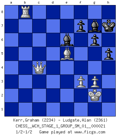 Last move : 1/2-1/2 2019 September 13 8:57:18 [Event "FICGS__CHESS__WCH_STAGE_1_GROUP_SM_01__000021"] [Site "FICGS"] [Date "2019.07.01"] [Round "1"] [White "Kerr,Graham"] [Black "Ludgate,Alan"] [Result "1/2-1/2"] [WhiteElo "2234"] [BlackElo "2361"] 1.d4 Nf6 2.c4 g6 3.g3 Bg7 4.Bg2 O-O 5.Nc3 d6 6.Nf3 Nbd7 7.e4 e5 8.O-O exd4 9.Nxd4 Re8 10.h3 Nc5 11.Re1 Bd7 12.Rb1 a6 13.b3 Qc8 14.Kh2 b5 15.cxb5 axb5 16.a3 Qa6 17.Bb2 Ne6 18.Nxe6 Bxe6 19.e5 dxe5 20.Bxa8 Qxa8 21.Qe2 c6 22.a4 Qc8 23.axb5 Bxh3 24.b6 Bg4 25.f3 Be6 26.Ra1 Qb8 27.Qf2 c5 28.Na4 Nd7 29.Kg2 h5 30.Nxc5 Nxc5 31.Qxc5 Rc8 32.Qe3 Rc2+ 33.Re2 Rxe2+ 34.Qxe2 Qxb6 35.Ra8+ Kh7 36.Bxe5 Qxb3 37.Rb8 Qc4 38.Qxc4 1/2-1/2 Graham Kerr gg, thanks ;-) I got your PM, but forgive an old technophobe, i couldn't figure out how to reply... King's Indian : 3.g3 Kingside Castling by player Black (move 4) Kingside Castling by player White (move 8) This chess game ended in a draw. Follow this game move after move (download)My style is somewhere between that of Tal and Petrosian. (Reshevsky) Schach ist Krieg, im Schach geht es um testosterongesteuerte Urschreie. (Garry Kasparov) La vida es como un juego de Ajedrez, cambiando con cada movimiento. (Proverbio Chino) Il a essayé de se convaincre qu'il pourrait empêcher toutes les erreurs et ne jamais perdre. L'horreur ! Gary Kasparov au sujet de Robert Fischer. If things go wrong, don't go with them. (Roger Babson)