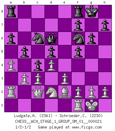Last move : 1/2-1/2 2019 July 3 20:35:48 [Event "FICGS__CHESS__WCH_STAGE_1_GROUP_SM_01__000021"] [Site "FICGS"] [Date "2019.07.01"] [Round "1"] [White "Ludgate,Alan"] [Black "Schroeder,Christoph"] [Result "1/2-1/2"] [WhiteElo "2361"] [BlackElo "2230"] 1.d4 Nf6 2.Bf4 d5 3.e3 c5 4.c3 Nc6 5.Nd2 Bf5 6.Qb3 Qd7 7.Ngf3 c4 8.Qd1 e6 9.Be2 b5 10.O-O Be7 11.Nh4 O-O 12.Nxf5 exf5 13.b3 Bd6 14.Bxd6 Qxd6 15.Qc2 g6 16.a4 a6 17.Ra2 1/2-1/2 Queen's pawn game Kingside Castling by player White (move 10) Kingside Castling by player Black (move 11) This chess game ended in a draw. Follow this game move after move (download)A chess genius has died; a loss for humanity. (Viktor Kortchnoi, about Bobby Fischer's death) Aljechin war kein Nazi. Er war ein Opportunist. Ein schrecklicher Mann. Er liebte Geld über alles und würde für Geld ein Jude, ein Katolik oder ein Protestant werden. (Miguel Najdorf) Cada Peón es potencialmente una Reina. (James Mason) Les échecs, c'est la lutte contre l'erreur. (Johannes Zukertort) If you are good, you will be assigned all the work. If you are really good, you will get out of it. (Dan Rotaru)