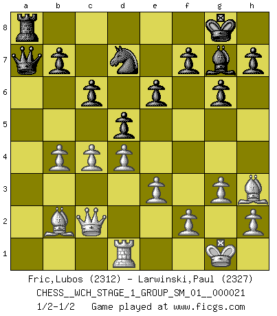 Last move : 1/2-1/2 2019 August 4 19:37:42 [Event "FICGS__CHESS__WCH_STAGE_1_GROUP_SM_01__000021"] [Site "FICGS"] [Date "2019.07.01"] [Round "1"] [White "Fric,Lubos"] [Black "Larwinski,Paul"] [Result "1/2-1/2"] [WhiteElo "2312"] [BlackElo "2327"] 1.Nf3 d5 2.g3 Nf6 3.Bg2 g6 4.O-O Bg7 5.c4 c6 6.b3 Ne4 7.d4 O-O 8.Bb2 Bf5 9.Nbd2 Nxd2 10.Qxd2 Be4 11.e3 e6 12.Qe2 Nd7 13.Rfd1 a5 14.Bh3 Bxf3 15.Qxf3 a4 16.Ba3 Re8 17.Qe2 axb3 18.axb3 Qb6 19.Qc2 Ra5 20.b4 Ra7 21.Bb2 Rea8 22.Rxa7 Qxa7 1/2-1/2 Reti : King's Indian attack (Barcza system) Kingside Castling by player White (move 4) Kingside Castling by player Black (move 7) This chess game ended in a draw. Follow this game move after move (download)Your body has to be in top condition. Your Chess deteriorates as your body does. You can't separate body from mind. (Bobby Fischer) Verschiedene, sehr schätzbare und im Laufe des Lebens nützliche Eigenschaften des Geistes können durch das Schachspiel erworben und gekräftigt werden, so dass sie zu Gewohnheiten werden, die uns nie im Stich lassen. (Benjamin Franklin) Cuando tu no sabes absolutamente que mas hacer, es tiempo de entrar en pánico. (John van der Wiel) Les Cavaliers se révèlent fort utiles dans les positions fermées. D'habitude, les Fous sont un peu plus forts que les Cavaliers dans les positions ouvertes. Qu'on le veuille ou non, il restera toujours des exceptions ! Crush them ! Make them suffer ! (General Grievous in Star Wars ep.3)