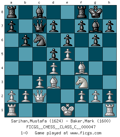 Last move : 1-0 2007 September 28 16:21:50 [Event "FICGS__CHESS__CLASS_C__000047"] [Site "FICGS"] [Date "2007.06.16"] [Round "1"] [White "Sarihan,Mustafa"] [Black "Baker,Mark"] [Result "1-0"] [WhiteElo "1624"] [BlackElo "1600"] 1.e4 c6 2.d4 Qc7 3.Nc3 Nf6 4.Nf3 g6 5.e5 Nd5 6.Nxd5 cxd5 7.c3 Nc6 8.Qb3 e6 9.Bg5 Bg7 10.Bf4 O-O 11.Bd3 b6 12.Qc2 1-0 Caro-Kann defense Kingside Castling by player Black (move 10) Player White won this chess game. Follow this game move after move (download)Winning isn't everything... but losing is nothing. (Mednis) Im Fernschach kannst du während dem Spiel rauchen. (John Christen Knudsen) Dios mío, Bobby Fischer juega tan simple. (Alexei Suetin) Mais l'homme est une créature légère et illogique : semblable au joueur d'échecs, il n'aime que le processus du but à atteindre, non le but lui-même. (Dostoïevsky) I just play for fun. (Anna Kournikova)