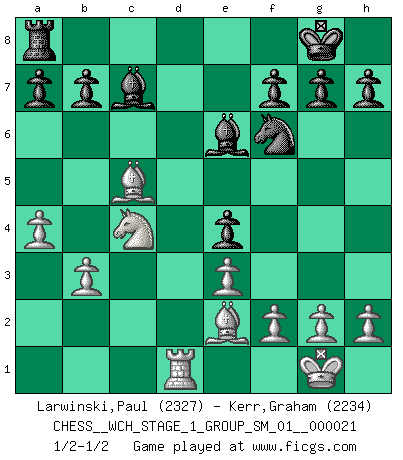 Last move : 1/2-1/2 2019 August 8 17:3:43 [Event "FICGS__CHESS__WCH_STAGE_1_GROUP_SM_01__000021"] [Site "FICGS"] [Date "2019.07.01"] [Round "1"] [White "Larwinski,Paul"] [Black "Kerr,Graham"] [Result "1/2-1/2"] [WhiteElo "2327"] [BlackElo "2234"] 1.d4 d5 2.c4 c6 3.Nf3 Nf6 4.Nc3 e6 5.e3 Nbd7 6.Be2 dxc4 7.a4 Bd6 8.Nd2 Bc7 9.Nxc4 e5 10.b3 O-O 11.Ba3 Re8 12.O-O e4 13.d5 Nxd5 14.Nxd5 cxd5 15.Qxd5 Nf6 16.Qxd8 Rxd8 17.Be7 Rd5 18.Rfd1 Rxd1+ 19.Rxd1 Be6 20.Bc5 1/2-1/2 QGD Slav : 4.Nc3 Kingside Castling by player Black (move 10) Kingside Castling by player White (move 12) This chess game ended in a draw. Follow this game move after move (download)Chess is in its essence a game, in its form an art, and in its execution a science. (Baron Tassilo) Bogoljubow: Matt in vier Zügen! Tartakower: Ich verbitte mir jede Belästigung! (Savielly Grigorievitsch Tartakower) Un jugador que trata de regresar una movida en el Ajedrez es un futuro carterista. (Richard Fenton) La vérité est comme le meilleur coup aux échecs : elle existe, mais il faut la chercher. (Arturo Perez-Reverte) Creativity is allowing yourself to make mistakes. Art is knowing which ones to keep. (Scott Adams)
