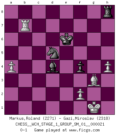 Last move : 0-1 2019 November 3 20:37:7 [Event "FICGS__CHESS__WCH_STAGE_1_GROUP_SM_01__000021"] [Site "FICGS"] [Date "2019.07.01"] [Round "1"] [White "Markus,Roland"] [Black "Gazi,Miroslav"] [Result "0-1"] [WhiteElo "2271"] [BlackElo "2318"] 1.d4 Nf6 2.Bf4 g6 3.Nf3 Bg7 4.e3 O-O 5.Be2 c5 6.c3 Qb6 7.Qb3 d6 8.Nbd2 cxd4 9.Qxb6 axb6 10.exd4 Nd5 11.Bg3 Bd7 12.a3 b5 13.O-O Bc6 14.Rfe1 Nd7 15.h3 N7b6 16.Bd3 Rfe8 17.Bh2 Bh6 18.Rac1 Kf8 19.Rc2 f6 20.g4 Nf4 21.Bf1 Nbd5 22.R2c1 Kf7 23.Bg3 Red8 24.Rcd1 g5 25.c4 bxc4 26.Nxc4 Bf8 27.Ne3 Nxe3 28.Rxe3 Nd5 29.R3e1 h6 30.Rc1 e6 31.h4 h5 32.gxh5 g4 33.Nd2 Bh6 34.Rc2 f5 35.Bh2 Nb6 36.Bc4 Re8 37.Bd3 Rad8 38.Nb3 Re7 39.Na5 Bf3 40.Bf1 Kf6 41.Bg2 Nd5 42.Nc4 Rc7 43.Bxf3 gxf3 44.a4 Bf4 45.Kh1 Rh8 46.Ne3 Rxc2 47.Nxc2 Rxh5 48.Bg3 e5 49.dxe5+ dxe5 50.Rd1 Ke6 51.Kg1 Rh8 52.Ne1 e4 53.Nxf3 exf3 54.Rd3 Bc1 55.Rxf3 Bxb2 56.Rb3 Bd4 57.Rxb7 f4 0-1 Queen's pawn game Kingside Castling by player Black (move 4) Kingside Castling by player White (move 13) Player Black won this chess game. Follow this game move after move (download)I have added these principles to the law: get the Knights into action before both Bishops are developed. (Emanuel Lasker) Man braucht nicht immer den besten Zug zu spielen: Ein Zug muß aktiv, unternehmungslustig, korrekt und schön sein. (David Bronstein) Fischer no está bajo la obligación de nadie. (Joseph Platz) Les échecs sont un jeu terrible. Si vous n'avez pas le centre, votre adversaire a une position plus libre. Par contre, si vous avez le centre, alors vous avez vraiment quelque chose pour laquelle vous inquiéter ! (Siegbert Tarrasch) There are two types of people in this world, good and bad. The good sleep better, but the bad seem to enjoy the waking hours much more. (Woody Allen)