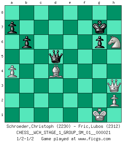 Last move : 1/2-1/2 2019 August 2 7:28:9 [Event "FICGS__CHESS__WCH_STAGE_1_GROUP_SM_01__000021"] [Site "FICGS"] [Date "2019.07.01"] [Round "1"] [White "Schroeder,Christoph"] [Black "Fric,Lubos"] [Result "1/2-1/2"] [WhiteElo "2230"] [BlackElo "2312"] 1.d4 Nf6 2.c4 e6 3.Nc3 Bb4 4.f3 d5 5.a3 Bxc3+ 6.bxc3 O-O 7.cxd5 exd5 8.e3 b6 9.Bd3 Re8 10.Ne2 c5 11.O-O Ba6 12.Ng3 Bxd3 13.Qxd3 Nc6 14.Bb2 h5 15.Rae1 h4 16.Nf5 h3 17.e4 Ne7 18.Ng3 Ng6 19.Bc1 hxg2 20.Kxg2 dxe4 21.fxe4 Qd7 22.Nf5 cxd4 23.cxd4 Nxe4 24.Rxe4 Qd5 25.Ng3 f5 26.Rxf5 Nh4+ 27.Kg1 Nxf5 28.Rxe8+ Rxe8 29.Nxf5 Re6 30.a4 Re4 31.Qh3 g6 32.Nh6+ Kg7 33.Be3 Rxd4 34.Bxd4+ 1/2-1/2 Nimzo-Indian : Kmoch variation Kingside Castling by player Black (move 6) Kingside Castling by player White (move 11) This chess game ended in a draw. Follow this game move after move (download)I'm not a materialistic person, in that, I don't suffer the lack or loss of money. The absence of worldly goods I don't look back on. For Chess is a way I can be as materialistic as I want without having to sell my soul. (Jamie Walter Adams) Ich würde die 30 stärksten Spieler der USA im Simultanspiel besiegen. (José Raúl Capablanca) Vive, pierde y aprende al observar a tu oponente como ganar. (Amber Steenbock) D'abord les bases : Jouez et étudiez, puis étudiez et jouez, ensuite jouez et étudiez, puis étudiez et jouez. Deuxièmement : Donnez toujours le meilleur de vous-même ! (Ken Smith) Treat your password like your toothbrush. Don't let anybody else use it, and get a new one every six months. (Clifford Stoll)