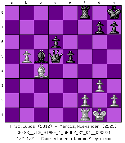 Last move : 1/2-1/2 2019 July 20 18:11:11 [Event "FICGS__CHESS__WCH_STAGE_1_GROUP_SM_01__000021"] [Site "FICGS"] [Date "2019.07.01"] [Round "1"] [White "Fric,Lubos"] [Black "Marciz,Alexander"] [Result "1/2-1/2"] [WhiteElo "2312"] [BlackElo "2223"] 1.Nf3 c5 2.e4 Nc6 3.d4 cxd4 4.Nxd4 Nf6 5.Nc3 e5 6.Ndb5 d6 7.Bg5 a6 8.Na3 b5 9.Nd5 Be7 10.Bxf6 Bxf6 11.c3 Bg5 12.Nc2 Rb8 13.a4 bxa4 14.Ncb4 Nxb4 15.cxb4 Bd7 16.Bxa6 O-O 17.b3 axb3 18.Qxb3 Qe8 19.O-O Kh8 20.Bc4 f5 21.exf5 Bxf5 22.b5 Bd8 23.Ra7 Be6 24.Qd3 Bxd5 25.Qxd5 Bb6 26.Rb7 Rxb7 27.Qxb7 Bc5 28.g3 Qa8 29.Qd5 Qxd5 1/2-1/2 Reti Opening Kingside Castling by player Black (move 16) Kingside Castling by player White (move 19) This chess game ended in a draw. Follow this game move after move (download)Best by test: 1. e4 (Bobby Fischer) Dein Körper muss in Topform sein. Dein Schach verfällt, wenn dein Körper verfällt. Der Körper kann nicht vom Geist getrennt werden. (Robert James Fischer) La belleza de un movimiento no se refleja solo en su apariencia, sino en el pensamiento detrás de él. (Siegbert Tarrasch) Un journaliste : 'Vous préférez avoir une dame de plus sur l'échiquier ou au lit ?' Boris Spassky : 'Ca dépend de la position.' The production of too many useful things results in too many useless people. (Karl Marx)