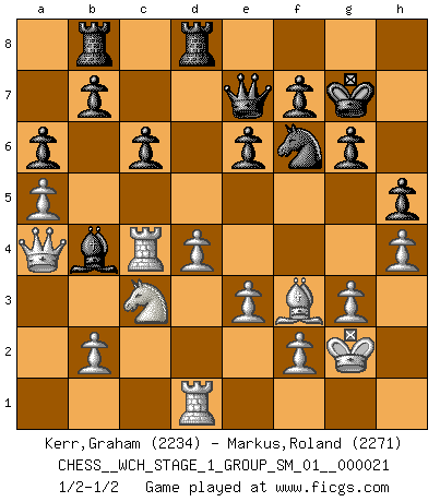 Last move : 1/2-1/2 2019 September 16 23:1:52 [Event "FICGS__CHESS__WCH_STAGE_1_GROUP_SM_01__000021"] [Site "FICGS"] [Date "2019.07.01"] [Round "1"] [White "Kerr,Graham"] [Black "Markus,Roland"] [Result "1/2-1/2"] [WhiteElo "2234"] [BlackElo "2271"] 1.d4 Nf6 2.c4 e6 3.Nf3 d5 4.g3 Be7 5.Bg2 O-O 6.O-O dxc4 7.Qc2 a6 8.a4 Bd7 9.Qxc4 Bc6 10.Bg5 Nbd7 11.Nc3 h6 12.Bxf6 Nxf6 13.e3 Bd5 14.Qe2 Bxf3 15.Bxf3 c6 16.Rfb1 Bb4 17.Kg2 Qe7 18.h4 g6 19.Qc4 h5 20.Rd1 Bd6 21.Qb3 Rfd8 22.a5 Rab8 23.Ra4 Kg7 24.Rc4 Bc7 25.Qa2 Bd6 26.Qa1 Bb4 27.Qa4 Bd6 28.Qc2 Bb4 29.Qa4 Bd6 30.Qc2 Bb4 31.Qa4 1/2-1/2 Queen's pawn game Kingside Castling by player Black (move 5) Kingside Castling by player White (move 6) This chess game ended in a draw. Follow this game move after move (download)Nothing excites jaded Grandmasters more than a theoretical novelty. (Dominic Lawson) Im Blitz ist es einfacher mit einer Figur weniger anzugreifen, als sich mit einer Mehrfigur zu verteidigen. (Mikhail Nekhemyevich Tal) Si pudieramos observar el interior de la cabeza de un jugador de Ajedrez, encontraríamos ahí un mundo lleno de sentimientos, imágenes, ideas, emoción y pasión. (Alfred Binet) Le pion, dans sa simplicité, marche droit devant lui, mais lorsqu'il prend, il le fait obliquement? Ainsi l'homme, tant qu'il reste pauvre, marche dans la droiture et vit honnêtement, mais lorsqu'il recherche les honneurs, il flatte, se parjure et, par les voies obliques, cherche une position supérieure sur l'échiquier du monde. (Jean de Galles) Art disturbs, science reassures. (Georges Braque, Le Jour et la Nuit)