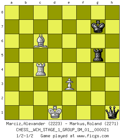 Last move : 1/2-1/2 2019 September 2 15:31:39 [Event "FICGS__CHESS__WCH_STAGE_1_GROUP_SM_01__000021"] [Site "FICGS"] [Date "2019.07.01"] [Round "1"] [White "Marciz,Alexander"] [Black "Markus,Roland"] [Result "1/2-1/2"] [WhiteElo "2223"] [BlackElo "2271"] 1.d4 Nf6 2.c4 e6 3.Nc3 d5 4.cxd5 exd5 5.Bg5 c6 6.e3 Be7 7.Bd3 Nbd7 8.Qc2 O-O 9.Nf3 Re8 10.O-O Nf8 11.h3 g6 12.Bh6 Bd6 13.a3 Ne6 14.Rfe1 Ng7 15.Bg5 Be7 16.b4 a6 17.Bf1 Bf5 18.Qb2 Ne6 19.Bh4 Ne4 20.Bxe7 Qxe7 21.Nxe4 Bxe4 22.Nd2 Ng5 23.h4 Ne6 24.Nxe4 dxe4 25.g3 Rad8 26.a4 Qf6 27.Qe2 Qf5 28.Bg2 g5 29.Qh5 Kg7 30.Rec1 h6 31.b5 axb5 32.axb5 cxb5 33.Rab1 Rd5 34.Rb4 Re7 35.Rc2 Re8 36.Rb1 gxh4 37.Qxf5 Rxf5 38.gxh4 Rh5 39.d5 Rxd5 40.Bxe4 Rh5 41.Bf3 Rxh4 42.Rxb5 Ng5 43.Bxb7 Ne4 44.Rd5 Rg4+ 45.Kf1 Re7 46.Bc8 Rg5 47.Rd4 h5 48.R2c4 f5 49.Bd7 h4 50.Bxf5 Nxf2 51.Rd7 Rxd7 52.Bxd7 Nd1 53.Ke2 h3 54.Kxd1 h2 55.Bc6 h1Q+ 1/2-1/2 Queen's pawn game Kingside Castling by player Black (move 8) Kingside Castling by player White (move 10) 10 pieces endgame at move 50 : White KRRBP , Black KRRNP WHITE : King + 2 Rooks 1 Bishop 1 Pawn BLACK : King + 2 Rooks 1 Knight 1 Pawn 9 pieces endgame at move 51 : White KRBP , Black KRRNP WHITE : King + 1 Rook 1 Bishop 1 Pawn BLACK : King + 2 Rooks 1 Knight 1 Pawn 8 pieces endgame at move 52 : White KRBP , Black KRNP WHITE : King + 1 Rook 1 Bishop 1 Pawn BLACK : King + 1 Rook 1 Knight 1 Pawn 7 pieces endgame at move 54 : White KRBP , Black KRP WHITE : King + 1 Rook 1 Bishop 1 Pawn BLACK : King + 1 Rook 1 Pawn Promotion Queen by player Black (move 55) This chess game ended in a draw. Follow this game move after move (download)Discovered check is the dive bomber of the Chessboard. (Reuben Fine) Obwohl ich alt bin, darf mir niemand den Finger in den Mund stecken, sonst beisse ich. (Wilhelm Steinitz) Todavía soy una víctima del Ajedrez. Tiene toda la belleza del arte y mucho mas. No puede ser comercializado. El Ajedrez es mas puro que el arte en su posición social. (Marcel Duchamp) Toutes choses étant égales, c'est la conviction qui gagne. Alliée à une volonté de vaincre, elle sert de détonateur, suscite des idées, disperse les doutes et aide à penser clairement. (Robert Fischer) Train yourself to let go of everything you fear to lose. (Master Yoda in Star Wars ep.3)