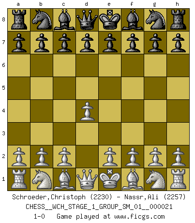 Last move : 1-0 2019 August 1 8:39:49 [Event "FICGS__CHESS__WCH_STAGE_1_GROUP_SM_01__000021"] [Site "FICGS"] [Date "2019.07.01"] [Round "1"] [White "Schroeder,Christoph"] [Black "Nassr,Ali"] [Result "1-0"] [WhiteElo "2230"] [BlackElo "2257"] 1.d4 1-0 This chess game has been lost on time (started : 2019.07.01 23:59:27) Queen's pawn Player White won this chess game. Follow this game move after move (download)We don't really know how the game was invented, though there are suspicions. As soon as we discover the culprits, we'll let you know. (Bruce Pandolfini) Rauchen ist dem Schachspieler bei seiner Arbeit, also im Wettkampf, untersagt. (Viktor Kortschnoi) Fischer no está bajo la obligación de nadie. (Joseph Platz) Si rien de grave n'est détecté lors de l'analyse d'une position, on joue alors le coup. Seconde règle de Blumenfeld. It's not a bug - it's an undocumented feature. (Anonymous)