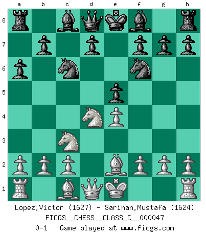 Last move : 0-1 2007 September 10 7:42:37 [Event "FICGS__CHESS__CLASS_C__000047"] [Site "FICGS"] [Date "2007.06.16"] [Round "1"] [White "Lopez,Victor"] [Black "Sarihan,Mustafa"] [Result "0-1"] [WhiteElo "1627"] [BlackElo "1624"] 1.e4 c5 2.Nf3 Nc6 3.d4 cxd4 4.Nxd4 a6 5.Nc3 Nf6 6.Be2 e5 0-1 This chess game has been lost on time (started : 2007.06.16 21:56:17) Sicilian defense Player Black won this chess game. Follow this game move after move (download)What is the difference between chess and football? Everybody understands football, but nobody plays it. Everybody plays chess, but nobody understands it. Everything is relative. (Vladimir Kramnik) Ich habe die Schachforschung dermaßen betrieben, dass sie auf eine wissenschaftliche Basis gestellt wurde. (Mikhail Moiseyevich Botvinik) El Ajedrez no es una pizca de inferior al violín, y tenemos un gran número de violinistas profesionales. (Mikhail Botvinnik) J'ai vu le vaincu d'Echecs jouer des années durant dans l'espoir de la fête de la victoire. Car tu es plus riche de ce qu'elle existe si même elle n'est point pour toi. Ainsi de la perle du fond des mers. (Antoine de Saint-Exupéry) Creativity involves breaking out of established patterns in order to look at things in a different way. (Edward De Bono)