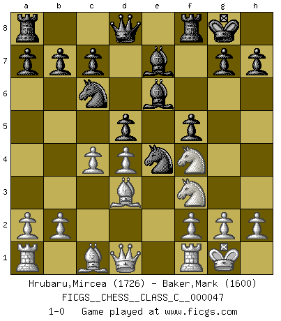 Last move : 1-0 2007 September 10 13:45:45 [Event "FICGS__CHESS__CLASS_C__000047"] [Site "FICGS"] [Date "2007.06.16"] [Round "1"] [White "Hrubaru,Mircea"] [Black "Baker,Mark"] [Result "1-0"] [WhiteElo "1726"] [BlackElo "1600"] 1.e4 e5 2.Nf3 Nf6 3.Nxe5 d6 4.Nf3 Nxe4 5.d4 d5 6.Bd3 Nc6 7.O-O Be7 8.Nc3 f5 9.Ne2 O-O 10.c4 Be6 11.Nf4 1-0 Petrov : Classical attack Kingside Castling by player White (move 7) Kingside Castling by player Black (move 9) Player White won this chess game. Follow this game move after move (download)Bobby just drops the pieces and they fall on the right squares. (Miguel Najdorf) Frage: Gibt es etwas was Sie mehr lieben als Autobahnen ohne Tempobegrenzungen? - Antwort: Deutsche Frauen ohne Tempobegrenzungen. (Loek van Wely) Bobby Fischer es el mas grande genio de Ajedrez de todos los tiempos. (Alexander Kotov) Les Echecs mettent en conflit, non pas deux intelligences, mais deux volontés. (Lasker) The existence of forgetting has never been proved: We only know that some things don't come to mind when we want them. (Friedrich Nietzsche)