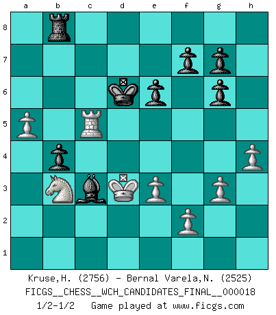 Last move : 1/2-1/2 2019 October 25 17:17:59 [Event "FICGS__CHESS__WCH_CANDIDATES_FINAL__000018"] [Site "FICGS"] [Date "2019.07.03"] [Round "1"] [White "Kruse,Herbert"] [Black "Bernal Varela,Nelson"] [Result "1/2-1/2"] [WhiteElo "2756"] [BlackElo "2525"] 1.Nf3 d5 2.d4 e6 3.c4 Nf6 4.g3 Be7 5.Bg2 O-O 6.O-O dxc4 7.Qc2 b5 8.a4 b4 9.Nfd2 c6 10.Nxc4 Qxd4 11.Rd1 Qc5 12.Be3 Qh5 13.Nbd2 Nd5 14.Qb3 Nxe3 15.Qxe3 Ba6 16.h4 Bc5 17.Qe4 Qg6 18.Qxg6 hxg6 19.Rac1 Be7 20.Nb3 Bxc4 21.Rxc4 Rc8 22.Rdc1 Bf6 23.R1c2 a5 24.Rc5 Rd8 25.Bxc6 Rd1+ 26.Kg2 Nxc6 27.Rxc6 Rb1 28.e3 Kf8 29.Kf3 Ke8 30.R6c5 Rb8 31.Ke2 Bc3 32.Kf3 Bf6 33.Nxa5 Rxb2 34.Rxb2 Bxb2 35.Nb3 Kd7 36.Ke2 Bc3 37.Kd3 Kd6 38.a5 Be1 39.Ke2 Bc3 40.Kd3 Be1 41.Ke2 Bc3 42.Kd3 1/2-1/2 Reti Opening Kingside Castling by player Black (move 5) Kingside Castling by player White (move 6) This chess game ended in a draw. Follow this game move after move (download)A big shock; the best chess player in history has passed away. (Lajos Portisch, about Bobby Fischer's death) Ich bin es gewohnt, das die Jugend mir überhaupt keinen Respekt entgegenbringt. (Alexander Morozewich) La estratégia requiere pensar, la táctica requiere observación. (Max Euwe) La tactique, c'est ce que vous faites quand il y a quelque chose à faire; la stratégie, c'est ce que vous faites quand il n'y a rien à faire. (Savielli Tartacower) Winning isn't everything... but losing is nothing. (Mednis)