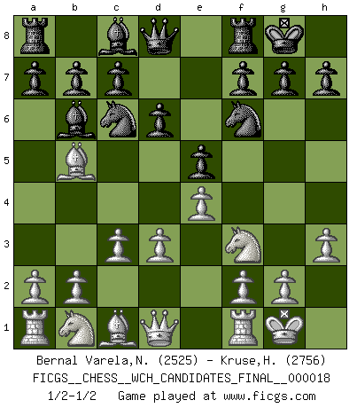 Last move : 1/2-1/2 2019 July 15 1:18:4 [Event "FICGS__CHESS__WCH_CANDIDATES_FINAL__000018"] [Site "FICGS"] [Date "2019.07.03"] [Round "4"] [White "Bernal Varela,Nelson"] [Black "Kruse,Herbert"] [Result "1/2-1/2"] [WhiteElo "2525"] [BlackElo "2756"] 1.e4 e5 2.Nf3 Nc6 3.Bb5 Nf6 4.d3 Bc5 5.c3 O-O 6.O-O d6 7.h3 Bb6 1/2-1/2 Ruy Lopez : Berlin defense Kingside Castling by player Black (move 5) Kingside Castling by player White (move 6) This chess game ended in a draw. Follow this game move after move (download)Your body has to be in top condition. Your Chess deteriorates as your body does. You can't separate body from mind. (Bobby Fischer) Ich las kürzlich ein Buch von Nietzsche. Er sagte Religion verdumme nur die Menschen. Ich stimme zu. (Robert James Fischer) Un mal plan es mejor que no tener ningún plan. (Frank Marshall) On n'a jamais que l'âge auquel on a commence à jouer aux échecs car après on cesse de vieillir. (Capablanca) Men should grow up. - Yeah. And dogs should stop licking themselves. It's not gonna happen. (Gregory House to Dr. Cameron, House M.D.)