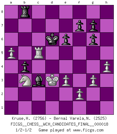 Last move : 1/2-1/2 2019 October 25 17:17:18 [Event "FICGS__CHESS__WCH_CANDIDATES_FINAL__000018"] [Site "FICGS"] [Date "2019.07.03"] [Round "5"] [White "Kruse,Herbert"] [Black "Bernal Varela,Nelson"] [Result "1/2-1/2"] [WhiteElo "2756"] [BlackElo "2525"] 1.Nf3 d5 2.d4 e6 3.c4 Nf6 4.g3 Be7 5.Bg2 O-O 6.O-O dxc4 7.Qc2 b5 8.a4 b4 9.Nfd2 c6 10.Nxc4 Qxd4 11.Rd1 Qc5 12.Be3 Qh5 13.Nbd2 Nd5 14.Qb3 Nxe3 15.Qxe3 Ba6 16.h4 Bc5 17.Qe4 Qg6 18.Qxg6 hxg6 19.Rac1 Be7 20.Nb3 Bxc4 21.Rxc4 Rc8 22.Rdc1 Bf6 23.R1c2 a5 24.Rc5 Rd8 25.Bxc6 Rd1+ 26.Kg2 Nxc6 27.Rxc6 Rb1 28.e3 Kf8 29.Kf3 Ke8 30.R6c5 Rb8 31.Nxa5 Rxb2 32.Rxb2 Bxb2 33.Nb3 Kd7 34.Ke2 Bc3 35.Kd3 Kd6 36.a5 Be1 37.Ke2 Bc3 38.Kd3 Be1 39.Ke2 Bc3 40.Kd3 1/2-1/2 Reti Opening Kingside Castling by player Black (move 5) Kingside Castling by player White (move 6) This chess game ended in a draw. Follow this game move after move (download)I have always a slight feeling of pity for the man who has no knowledge of Chess. (Siegbert Tarrasch) Das ganze Leben mit einer Ehefrau ist wie ein Endspiel mit ungleichfarbigen Läufern. (Viktor Kortschnoi) Tu no necesitas jugar muy bien, únicamente ayudar a tu oponenet a que juegue muy mal. (Genrikh Chepukaitis) Il (Jacob Murray) ne joue pas pour le bon coup, mais pour le meilleur. (Eloi Relange) No enterprise is more likely to succeed than one concealed from the enemy until it is ripe for execution. (Niccolo Machiavelli)