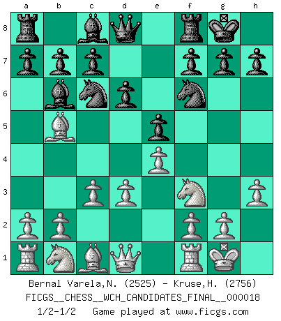 Last move : 1/2-1/2 2019 July 15 1:18:28 [Event "FICGS__CHESS__WCH_CANDIDATES_FINAL__000018"] [Site "FICGS"] [Date "2019.07.03"] [Round "8"] [White "Bernal Varela,Nelson"] [Black "Kruse,Herbert"] [Result "1/2-1/2"] [WhiteElo "2525"] [BlackElo "2756"] 1.e4 e5 2.Nf3 Nc6 3.Bb5 Nf6 4.d3 Bc5 5.c3 O-O 6.O-O d6 7.h3 Bb6 1/2-1/2 Ruy Lopez : Berlin defense Kingside Castling by player Black (move 5) Kingside Castling by player White (move 6) This chess game ended in a draw. Follow this game move after move (download)If your opponent offers you a draw, try to work out why he thinks he's worse off. (Nigel Short) Wie, soll nun auch die Opposition abgeschafft werden? Ja, es tut mir leid, Ihnen diesen Schmerz nicht ersparen zu können. (Aaron Nimzowitsch) Solo el jugador con la iniciativa tiene el derecho a atacar. (Wilhelm Steinitz) La menace est plus forte que l'exécution. (Aaron Nimzovitch) Mac users swear by their computers. PC users swear at their computers. (Author unknown)