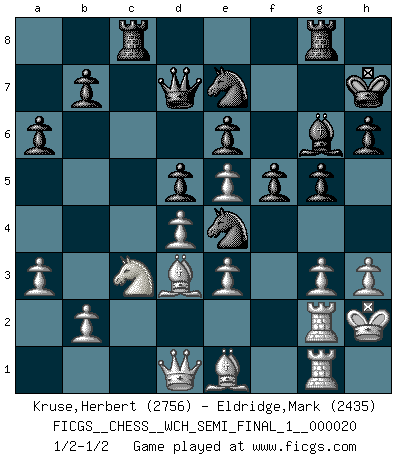 Last move : 1/2-1/2 2019 October 25 22:27:50 [Event "FICGS__CHESS__WCH_SEMI_FINAL_1__000020"] [Site "FICGS"] [Date "2019.07.03"] [Round "1"] [White "Kruse,Herbert"] [Black "Eldridge,Mark"] [Result "1/2-1/2"] [WhiteElo "2756"] [BlackElo "2435"] 1.Nf3 d5 2.d4 Nf6 3.c4 c6 4.cxd5 cxd5 5.Nc3 Nc6 6.Bf4 Nh5 7.Bc1 e6 8.Bg5 f6 9.Bd2 f5 10.e3 Nf6 11.Ne5 Bd6 12.Nd3 Bd7 13.Be2 Rc8 14.O-O O-O 15.Rc1 Qe7 16.a3 Rfd8 17.Be1 Be8 18.h3 g5 19.f4 Ne4 20.Kh1 h6 21.g3 Kh7 22.Ne5 a6 23.Rg1 Bxe5 24.fxe5 Qd7 25.Rc2 Bg6 26.Bd3 Rg8 27.Kh2 Ne7 28.Rcg2 1/2-1/2 Reti Opening Kingside Castling by player White (move 14) Kingside Castling by player Black (move 14) This chess game ended in a draw. Follow this game move after move (download)Chess is above all, a fight ! (Emanuel Lasker) Ich verlor meine Bürgerrechte, mein Gehalt wurde mir nicht mehr bezahlt und ich wurde zensiert und durfte nicht mehr ins Ausland reisen. [nach dem Match Fischer-Taimanov 6:0] (Mark Taimanov) No solamente yo pronostico su triunfo sobre Botvinnik, sino que me adelanto y digo que probablemente Fischer es el jugador de Ajedrez mas grande que haya existido. (John Collins) Celui qui prend des risques peut perdre, celui qui n'en prend pas perd toujours. (Xavier Tartacover) Sometimes it pays to stay in bed in Monday, rather than spending the rest of the week debugging Monday's code. (Dan Salomon)