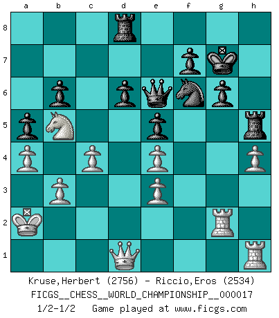 Last move : 1/2-1/2 2019 October 21 5:37:58 [Event "FICGS__CHESS__WORLD_CHAMPIONSHIP__000017"] [Site "FICGS"] [Date "2019.07.03"] [Round "6"] [White "Kruse,Herbert"] [Black "Riccio,Eros"] [Result "1/2-1/2"] [WhiteElo "2756"] [BlackElo "2534"] 1.Nf3 c5 2.e4 d6 3.d4 cxd4 4.Nxd4 Nf6 5.Nc3 a6 6.Nb3 g6 7.Be3 Bg7 8.Be2 O-O 9.g4 Nbd7 10.a4 b6 11.g5 Ne8 12.Bd4 h5 13.gxh6 Bxh6 14.Qd3 Nc5 15.Qg3 e5 16.Be3 Bxe3 17.fxe3 Nxb3 18.cxb3 Be6 19.Bc4 Bxc4 20.bxc4 Kg7 21.h4 Nf6 22.O-O-O Rh8 23.Qf3 Qe7 24.Rdf1 Rh5 25.Rf2 Rf8 26.Kb1 Qe6 27.b3 Ng4 28.Rg2 Nf6 29.Rf2 Ng4 30.Rg2 Nf6 31.Qd1 a5 32.Nb5 Rd8 33.Ka2 Rh6 34.Qd3 Rh5 35.Qd1 1/2-1/2 Reti Opening Kingside Castling by player Black (move 8) Queenside Castling by player White (move 22) This chess game ended in a draw. Follow this game move after move (download)For surely of all the drugs in the world, Chess must be the most permanently pleasurable. (Assiac) Die westlichen Werte sind eine Sprache, welche die Putin-Administration nicht versteht. (Garry Kasparov) El Ajedrez es como la guerra en un tablero. (Bobby Fischer) Mais n'est-ce pas déjà le limiter injurieusement que d'appeler les échecs un jeu? N'est-ce pas aussi une science, un art, ou quelque chose qui, comme le cercueil de Mahomet entre ciel et terre, est suspendu entre l'un et l'autre, et qui réunit un nombre incroyable de contraires ? (Stefan Zweig) Political correctness is subjecting us to gross incompetence. (Johann Piek)