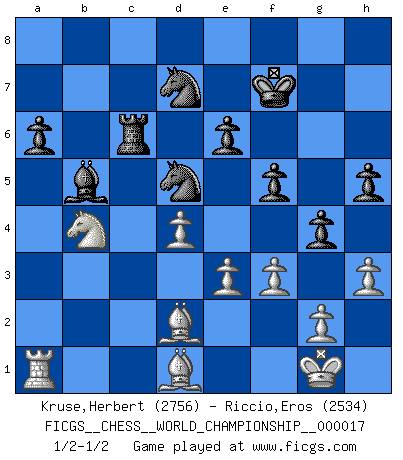 Last move : 1/2-1/2 2019 October 21 12:33:11 [Event "FICGS__CHESS__WORLD_CHAMPIONSHIP__000017"] [Site "FICGS"] [Date "2019.07.03"] [Round "8"] [White "Kruse,Herbert"] [Black "Riccio,Eros"] [Result "1/2-1/2"] [WhiteElo "2756"] [BlackElo "2534"] 1.d4 d5 2.c4 e6 3.Nc3 c6 4.e3 Nf6 5.Nf3 Nbd7 6.Qc2 Bd6 7.Bd3 O-O 8.O-O dxc4 9.Bxc4 a6 10.Rd1 b5 11.Bd3 Qc7 12.Bd2 c5 13.Ne4 c4 14.Nxd6 Qxd6 15.Be2 Bb7 16.b3 Bd5 17.Qb2 Ne4 18.Be1 Rfc8 19.Rdc1 f6 20.Rc2 Rc6 21.Ba5 Rac8 22.Ne1 f5 23.bxc4 Bxc4 24.Bb4 Qd5 25.Bd1 g5 26.h3 h5 27.f3 Nef6 28.a4 g4 29.axb5 Qxb5 30.Bd2 Kf7 31.Qxb5 Bxb5 32.Rxc6 Rxc6 33.Nc2 Nd5 34.Nb4 1/2-1/2 QGD : Semi-Slav Kingside Castling by player Black (move 7) Kingside Castling by player White (move 8) This chess game ended in a draw. Follow this game move after move (download)For me, Chess is life and every game is like a new life. Every Chess player gets to live many lives in one lifetime. (Eduard Gufeld) Ich verstehe Aljechins Kombinationen ganz gut; aber woher er diese Angriffschancen bekommt und wie er die Eröffnung behandelt das ist für mich ein Buch mit sieben Siegeln. (Rudolf Spielmann) No solamente yo pronostico su triunfo sobre Botvinnik, sino que me adelanto y digo que probablemente Fischer es el jugador de Ajedrez mas grande que haya existido. (John Collins) Demandez au pauvre Cg1 ce qu'il en pense. Eduard Gufeld à propos de la variante Saemisch de l'Est-Indienne. I don't believe in psychology. I believe in good moves. (Bobby Fischer)