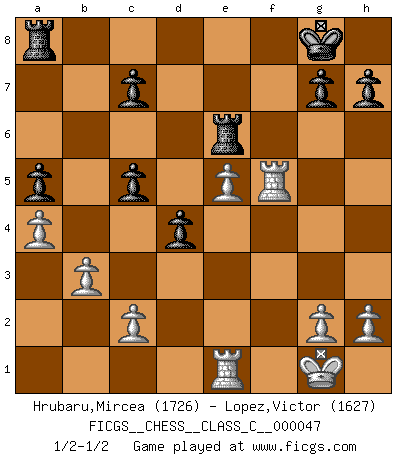Last move : 1/2-1/2 2007 November 2 6:18:10 [Event "FICGS__CHESS__CLASS_C__000047"] [Site "FICGS"] [Date "2007.06.16"] [Round "1"] [White "Hrubaru,Mircea"] [Black "Lopez,Victor"] [Result "1/2-1/2"] [WhiteElo "1726"] [BlackElo "1627"] 1.e4 e5 2.Nf3 Nc6 3.Bc4 Nf6 4.d4 exd4 5.e5 d5 6.Bb5 Ne4 7.Nxd4 Bc5 8.Be3 Bd7 9.Bxc6 bxc6 10.Nd2 Nxd2 11.Qxd2 O-O 12.O-O Re8 13.Qc3 Bb6 14.Nb3 Qe7 15.f4 f6 16.Bc5 a5 17.a4 fxe5 18.fxe5 Qh4 19.Qf3 Be6 20.Qe3 Qb4 21.Bxb6 Qxb6 22.Nd4 Bd7 23.b3 c5 24.Nf5 d4 25.Qg5 Bxf5 26.Qxf5 Qe6 27.Rae1 Qxf5 28.Rxf5 Re6 1/2-1/2 Two knights defense Kingside Castling by player Black (move 11) Kingside Castling by player White (move 12) This chess game ended in a draw. Follow this game move after move (download)Chess is a part of culture and if a culture is declining then Chess too will decline. (Mikhail Botvinnik) Ihnen, Herr Lasker, habe ich nur drei Worte zu sagen: Schach und matt. (Siegbert Tarrasch) Un mal día en el Ajedrez, es mejor que cualquier buen día en el trabajo. (Anonymous) L'attaque fait le spectacle, la défense gagne les matchs. (Dicton footballistique) Luck never gives; it only lends. (Swedish proverb)