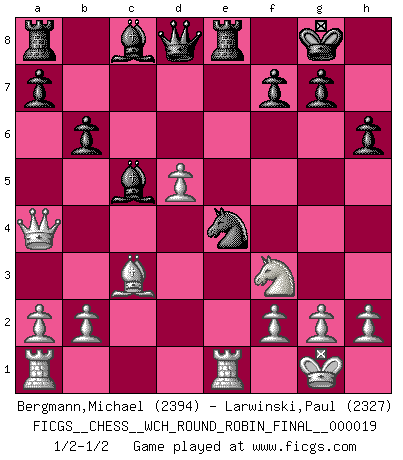 Last move : 1/2-1/2 2019 July 21 14:33:49 [Event "FICGS__CHESS__WCH_ROUND_ROBIN_FINAL__000019"] [Site "FICGS"] [Date "2019.07.04"] [Round "1"] [White "Bergmann,Michael"] [Black "Larwinski,Paul"] [Result "1/2-1/2"] [WhiteElo "2394"] [BlackElo "2327"] 1.d4 d5 2.c4 c6 3.Nf3 Nf6 4.e3 e6 5.Bd3 Nbd7 6.Nbd2 Bd6 7.O-O O-O 8.e4 e5 9.cxd5 cxd5 10.Re1 h6 11.exd5 exd4 12.Ne4 Nxe4 13.Bxe4 Nf6 14.Qxd4 b6 15.Bd2 Bc5 16.Qa4 Re8 17.Bc3 Nxe4 1/2-1/2 QGD Slav : 4.e3 Kingside Castling by player White (move 7) Kingside Castling by player Black (move 7) This chess game ended in a draw. Follow this game move after move (download)Even the laziest King flees wildly in the face of a double check ! (Aaron Nimzowitsch) Fischer machte Schach einfach zu einer aufregenden Sache, wann immer er sich ans Brett setzte. (Raymond Keene) Una buena memoria, concentración, imaginación y una fuerte voluntad, se requiere para llegar a ser un buen jugador. (Bobby Fischer) Les Echecs ne sont pas pour les âmes timides. Ils requièrent un homme entier, qui ne s'arrête pas aveuglément à ce qui a été déjà établi, mais qui tente individuellement de sonder les profondeurs du jeu. (W. Steinitz) The greatest con, that he ever pulled... was making you believe... that he is you. (Revolver, movie)