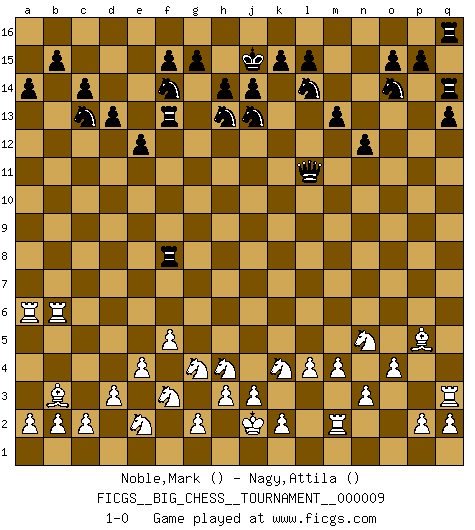 Last move : 1-0 2007 October 1 22:52:41 [Event "FICGS__BIG_CHESS__TOURNAMENT__000009"] [Site "FICGS"] [Date "2007.06.17"] [Round "1"] [White "Noble,Mark"] [Black "Nagy,Attila"] [Result "1-0"] [WhiteElo ""] [BlackElo ""] 1.j2-k4 j15-h13 2.h2-g4 h16-o10 3.p1-o3 n15-n13 4.e2-e4 d15-d13 5.b1-c3 e15-e13 6.f1-c4 m15-m13 7.d2-d3 p16-o14 8.c1-h6 g16-f14 9.m2-m4 k16-l14 10.l1-p5 b16-c14 11.n2-n3 c16-k9 12.o1-g8 f16-c13 13.k1-h2 o16-g9 14.h1-p8 q16-p16 15.g1-j2 l16-o13 16.m1-m2 h15-j13 17.o3-n5 e13-e12 18.o2-o4 e16-e13 19.j2-h4 a16-e16 20.l2-l4 o13-m11 21.p8-m8 o10-b10 22.c4-b3 e13-f13 23.f2-f4 k9-h7 24.g8-h7 m11-h7 25.m8-m7 h7-k9 26.m7-k9 f13-f11 27.k9-g9 c13-g9 28.j1-j2 c14-e13 29.f4-f5 c15-c14 30.h2-f3 e13-d11 31.q1-o1 e16-e13 32.o1-o3 q15-q13 33.e1-o1 j16-j15 34.o3-q3 g9-f8 35.h6-f8 f11-f8 36.o1-o3 n13-n12 37.a1-o1 e13-f13 38.q3-q6 p16-q16 39.o3-q3 q16-q14 40.o1-o3 b10-m10 41.c3-e2 m16-q16 42.q6-a6 a15-a14 43.q3-q6 m10-l11 44.q6-b6 d11-c13 45.o3-q3 1-0 This big chess game has been lost on time (started : 2007.06.17 12:14:29) Follow this game move after move (download)When you see a good move, look for a better one. (Emanuel Lasker) Es gibt zwei Arten von Opfern: Korrekte und meine. (Mikhail Nekhemyevich Tal) Con el fin de mejorar tu juego, debes de estudiar los finales antes que todo, ya que mientras que los finales pueden ser estudiados y dominados por sí mismos, el juegomedio y la apertura deben de ser estudiados en relación con los finales. (José Raúl Capablanca) Une platitude souvent récitée à propos des Echecs est qu'une des choses les plus difficiles à réaliser est de gagner une position gagnante. Cela ne manque pas de sens mais, pour ma part, j'ai toujours trouvé plus difficile de gagner une position perdante. (Tim Krabbe) The only thing that overcomes hard luck is hard work. (Harry Golden)