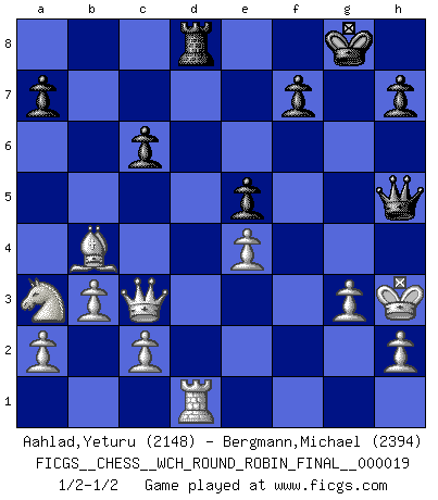 Last move : 1/2-1/2 2019 August 15 17:42:0 [Event "FICGS__CHESS__WCH_ROUND_ROBIN_FINAL__000019"] [Site "FICGS"] [Date "2019.07.04"] [Round "1"] [White "Aahlad,Yeturu"] [Black "Bergmann,Michael"] [Result "1/2-1/2"] [WhiteElo "2148"] [BlackElo "2394"] 1.e4 c5 2.Nf3 d6 3.d4 cxd4 4.Nxd4 Nf6 5.Bd3 Nc6 6.Be3 Ng4 7.Nxc6 bxc6 8.Bd2 g6 9.Bc3 e5 10.O-O Bg7 11.Bb4 O-O 12.Be2 Qh4 13.Bxg4 Bxg4 14.Qxd6 Rfd8 15.Qe7 Bf6 16.Qc5 Bf3 17.gxf3 Qg5+ 18.Kh1 Qh5 19.Qc3 Bg5 20.Rg1 Bf4 21.Rg3 Rd1+ 22.Kg2 Rad8 23.b3 g5 24.Na3 Bxg3 25.fxg3 g4 26.fxg4 Qxg4 27.Rxd1 Qe2+ 28.Kh3 Qh5+ 1/2-1/2 Sicilian Kingside Castling by player White (move 10) Kingside Castling by player Black (move 11) This chess game ended in a draw. Follow this game move after move (download)Openings teach you openings. Endgames teach you chess ! (Stephan Gerzadowicz) Ein Teil des Fehlers ist immer korrekt. (Savielly Grigorievitsch Tartakower) Dejen al perfeccionista jugar por correo. (Yasser Seirawan) La victoire dans une partie d'Echecs appartient la plupart du temps à celui qui voit un peu plus loin que l'adversaire. (Lasker) Logic : The art of thinking and reasoning in strict accordance with the limitations and incapacities of the human misunderstanding. (Ambrose Bierce)