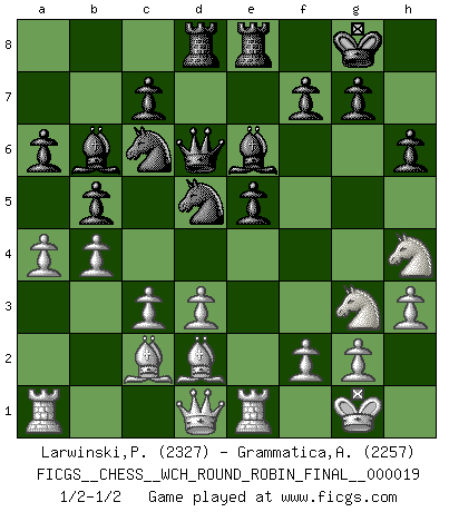 Last move : 1/2-1/2 2019 July 19 11:57:40 [Event "FICGS__CHESS__WCH_ROUND_ROBIN_FINAL__000019"] [Site "FICGS"] [Date "2019.07.04"] [Round "1"] [White "Larwinski,Paul"] [Black "Grammatica,Andrea"] [Result "1/2-1/2"] [WhiteElo "2327"] [BlackElo "2257"] 1.e4 e5 2.Nf3 Nc6 3.Bc4 Nf6 4.d3 Bc5 5.c3 a6 6.Bb3 Ba7 7.O-O O-O 8.Re1 d6 9.h3 h6 10.Nbd2 Be6 11.Nf1 d5 12.exd5 Nxd5 13.Bd2 Re8 14.Bc2 Qd6 15.b4 Rad8 16.a4 b5 17.Ng3 Bb6 18.Nh4 1/2-1/2 Two knights defense (Modern Bishop's Opening) Kingside Castling by player White (move 7) Kingside Castling by player Black (move 7) This chess game ended in a draw. Follow this game move after move (download)When I asked Fischer why he had not played a certain move in our game, he replied: 'Well, you laughed when I wrote it down !' (Mikhail Tal) Im Leben werden Partien nie so unstrittig gewonnen wie im Spiel (Emanuel Lasker) Por esta medida (el intervalo entre Fischer y sus contemporaneos), yo le considero el mas grande campeón mundial. (Garry Kasparov) Aucun coup ne doit être joué sans but. (Pedro Damiano) All maxims have their antagonist maxims; proverbs should be sold in pairs, a single one being but a half truth. (William Mathews)
