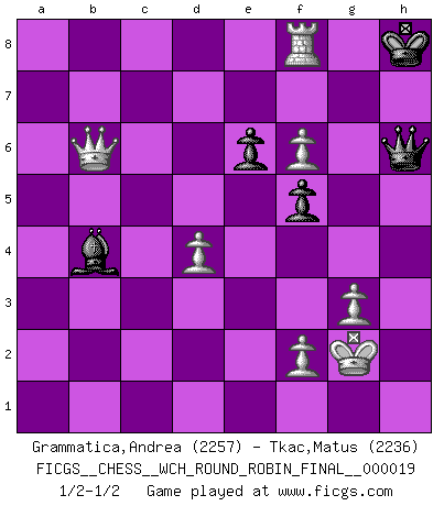 Last move : 1/2-1/2 2019 October 28 18:30:18 [Event "FICGS__CHESS__WCH_ROUND_ROBIN_FINAL__000019"] [Site "FICGS"] [Date "2019.07.04"] [Round "1"] [White "Grammatica,Andrea"] [Black "Tkac,Matus"] [Result "1/2-1/2"] [WhiteElo "2257"] [BlackElo "2236"] 1.d4 Nf6 2.c4 e6 3.Nf3 b6 4.a3 Bb7 5.Nc3 d5 6.cxd5 Nxd5 7.Qc2 Nxc3 8.bxc3 Be7 9.e4 O-O 10.Bd3 c5 11.O-O Qc7 12.Qe2 Re8 13.Rd1 Nd7 14.e5 Red8 15.Be3 Nf8 16.h4 h6 17.h5 Kh8 18.Nd2 cxd4 19.cxd4 f5 20.Rdc1 Qd7 21.Bb5 Qd5 22.Nf3 a6 23.Bc4 Qd7 24.a4 Bb4 25.Rab1 Qxa4 26.Ra1 Qe8 27.Bxa6 Bxa6 28.Rxa6 Rxa6 29.Qxa6 Ba5 30.Rc7 Qxh5 31.Qb7 g5 32.Rf7 Kg8 33.Rg7+ Kh8 34.g3 Bb4 35.Kg2 Qe8 36.Nxg5 hxg5 37.Bxg5 Nd7 38.Bf6 Nxf6 39.exf6 Qf8 40.Rf7 Qh6 41.Qxb6 Rf8 42.Rxf8+ 1/2-1/2 Queen's Indian : Petrosian system Kingside Castling by player Black (move 9) Kingside Castling by player White (move 11) This chess game ended in a draw. Follow this game move after move (download)In complicated positions, Bobby Fischer hardly had to be afraid of anybody. (Paul Keres) Je mehr ich von der FIDE weiss, um so weniger verstehe ich. (Alexander Kalifman) El Ajedrez expande y enriquece tu mente. (Saudin Robovic) Demandez au pauvre Cg1 ce qu'il en pense. Eduard Gufeld à propos de la variante Saemisch de l'Est-Indienne. As the days dwindle down... to a precious few. (Maxwell Anderson)