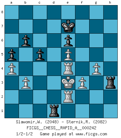 Last move : 1/2-1/2 2019 September 7 22:39:51 [Event "FICGS__CHESS__RAPID_A__000242"] [Site "FICGS"] [Date "2019.07.06"] [Round "1"] [White "Slawomir,Weglicki"] [Black "Sternik,Ryszard"] [Result "1/2-1/2"] [WhiteElo "2048"] [BlackElo "2082"] 1.d4 Nf6 2.c4 e6 3.g3 d5 4.Bg2 Be7 5.Nf3 O-O 6.O-O dxc4 7.Qc2 a6 8.a4 Bd7 9.Qxc4 Bc6 10.Bf4 a5 11.Nc3 Na6 12.Rac1 Nb4 13.Ne5 Bxg2 14.Kxg2 Nfd5 15.Nxd5 Qxd5+ 16.Qxd5 Nxd5 17.Nd3 c6 18.Bd2 Rfd8 19.e3 f6 20.Rfd1 Kf7 21.b3 g5 22.Nc5 b6 23.Nd3 Rac8 24.Kf3 h5 25.Ke2 Ba3 26.Rc4 Ne7 27.e4 Bd6 28.h3 Bc7 29.Be3 Rg8 30.Rdc1 Ra8 31.g4 Rh8 32.e5 fxe5 33.Bxg5 hxg4 34.Bxe7 e4 35.Ne5+ Bxe5 36.dxe5 Kxe7 37.hxg4 c5 38.Rxe4 Raf8 39.Rg1 Rh2 40.Rf1 Rd8 41.Ke3 Kf7 42.Rf4+ Ke7 43.Re1 Rd5 44.Re4 Kf7 45.Re2 Rd1 46.Rf4+ Ke7 47.Rc4 Rd5 48.Re4 Rh3+ 49.f3 Rd1 50.Rc4 Rd5 51.Re4 Rd1 1/2-1/2 Catalan : Closed, 5.Nf3 Kingside Castling by player Black (move 5) Kingside Castling by player White (move 6) This chess game ended in a draw. Follow this game move after move (download)When you don't know what to play, wait for an idea to come into your opponent's mind. You may be sure that idea will be wrong. (Siegbert Tarrasch) Das Blackmar-Diemer-Gambit verändert den ganzen Menschen! (Emil Joseph Diemer) Yo considero que Fischer es uno de los expertos mas grandes de aperturas de siempre. (Keith Hayward) À la honte des hommes, on sait que les lois du jeu sont les seules qui soient partout justes, claires, inviolables et exécutées. Pourquoi l'Indien qui a donné les règles du jeu d'échecs est-il obéi de bon gré dans toute la terre, et que les décrétales des papes, par exemple, sont aujourd'hui un objet d'horreur et de mépris ? C'est que l'inventeur des échecs combina tout avec justesse pour la satisfaction des joueurs, et que les papes, dans leurs décrétales, n'eurent en vue que leur seul avantage. L'Indien voulut exercer également l'esprit des hommes et leur donner du plaisir; les papes ont voulu abrutir l'esprit des hommes. Voltaire (Dictionnaire philosophique / Garnier 1967) Somehow our devils are never quite what we expect when we meet them face to face. (Nelson DeMille)