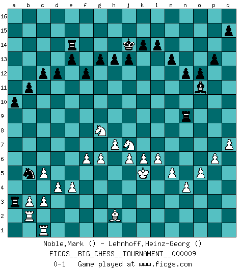 Last move : 0-1 2008 February 19 2:30:46 [Event "FICGS__BIG_CHESS__TOURNAMENT__000009"] [Site "FICGS"] [Date "2007.06.17"] [Round "1"] [White "Noble,Mark"] [Black "Lehnhoff,Heinz-Georg"] [Result "0-1"] [WhiteElo ""] [BlackElo ""] 1.j2-k4 g15-g13 2.h1-o7 h16-f14 3.h2-g4 p16-o14 4.e2-e4 b16-c14 5.f1-c4 m15-m13 6.d2-d3 e15-e13 7.e1-e3 f14-g14 8.o7-c7 j15-k13 9.e3-f3 f15-f13 10.c1-h6 n15-n13 11.m2-m4 l16-p12 12.k1-h2 o16-j11 13.l1-o4 j11-h12 14.c7-f7 f13-f12 15.n2-n3 d15-d13 16.g1-j2 g14-b9 17.c4-b3 c16-f13 18.b1-c3 f16-b12 19.o4-k8 h12-e9 20.h6-e9 b12-e9 21.p1-o3 e16-e14 22.o1-g8 l15-l14 23.f3-f5 b9-c10 24.m1-m3 c10-f7 25.g8-f7 c14-d12 26.j2-h4 c15-c13 27.h2-j4 b15-b13 28.a1-e1 a15-a13 29.g4-h6 h15-f14 30.o3-n5 a13-a12 31.g2-g4 c13-c12 32.o2-o4 b13-b12 33.p2-p4 b12-b11 34.q2-q4 d12-c10 35.p4-p5 k16-h15 36.j1-j2 g16-j15 37.h6-g8 e9-h12 38.l2-l4 p12-k7 39.q1-q2 o14-p12 40.q4-q5 m16-m14 41.j4-h6 k7-n4 42.m3-l3 c10-d8 43.f7-d5 o15-o13 44.m4-m5 n4-o5 45.k4-l6 o13-o12 46.k2-k4 q16-o16 47.h4-k5 m14-q14 48.q5-q6 q14-q9 49.h3-h4 o16-o14 50.f5-f3 f13-b9 51.f3-g3 o5-g12 52.f2-f4 d8-b7 53.j3-j4 f14-e12 54.j2-j3 e12-d10 55.f4-f5 b9-d7 56.q2-e2 h12-a5 57.e1-f1 q9-b9 58.e2-g2 b7-c5 59.c3-e2 c5-b3 60.d5-b3 o14-q14 61.g4-g5 q14-q11 62.g8-f6 d7-j12 63.h4-h5 j15-h13 64.j3-k3 j16-j15 65.e2-f4 h15-j13 66.f4-g6 p15-p13 67.f6-g8 g12-b7 68.k5-j7 h13-g11 69.n5-m7 p12-n11 70.g8-h10 j12-h13 71.l3-m3 n11-m9 72.k8-m6 n13-n12 73.m7-k8 a5-c7 74.g3-g4 c7-d6 75.h10-g8 a12-a11 76.j4-j5 a11-a10 77.h6-f7 d6-c7 78.g6-e7 q11-m11 79.k4-k5 k15-k14 80.l4-l5 b9-a9 81.k8-m9 h13-m9 82.l6-k8 m9-n8 83.k3-k4 d10-f9 84.e7-f9 g11-f9 85.g5-g6 k13-h12 86.m3-m4 n8-p6 87.n3-n4 a16-p16 88.o4-o5 p6-k11 89.k5-k6 h12-j10 90.k8-j10 k11-j10 91.p5-p6 b7-c6 92.q6-q7 j13-k11 93.h5-h6 k11-l9 94.h6-h7 f9-g7 95.k4-k5 c6-j12 96.j5-j6 j12-n8 97.j7-l6 g7-h5 98.f1-f3 h5-g7 99.f3-j3 j10-l8 100.g4-j4 l8-o11 101.g8-j7 j14-j13 102.f7-h6 c7-d8 103.j3-j1 j15-j14 104.j4-j5 d8-f6 105.c2-c3 g7-e8 106.h6-g8 f6-g7 107.j5-j2 g7-l3 108.m4-j4 l3-j1 109.j2-j1 l9-n10 110.g2-h2 n10-m8 111.j4-m4 e8-g7 112.h2-h6 p16-p14 113.f5-f6 a9-a5 114.b3-d5 g7-e8 115.j1-j5 h14-h13 116.b2-b4 a5-a3 117.d5-b3 m11-c11 118.j5-e5 m8-l6 119.j7-l6 n8-j12 120.e5-c5 c11-c5 121.b4-c5 a3-a5 122.d3-d4 e8-c7 123.h6-h2 p14-q14 124.l6-j7 q14-q9 125.l5-l6 j12-a4 126.h2-b2 a4-b3 127.a2-b3 a5-a3 128.m4-m1 q9-b9 129.m1-b1 d13-d12 130.m6-h2 c7-b5 131.b1-c1 b9-n9 0-1 Follow this game move after move (download)Nowadays, when you're not a grandmaster at 14, you can forget about it. (Anand Viswanathan) Bis zum Jahr 1971 verlief in meiner Schachkariere alles glatt. Dieses dramatische Match [Fischer-Taimanov 6:0] machte mein Leben zur Hölle. (Mark Taimanov) Observen a Garry Kasparov. Después de una derrota, invariablemente el gana la próxima partida. Prácticamente hace pedazos a su siguiente oponente. Eso es algo que tenemos que aprender a lograr. (Maurice Ashley) Votre seul travail dans les ouvertures est d'obtenir un milieu de partie jouable. (Lajos Portish) The hypothalamus is one of the most important parts of the brain, involved in many kinds of motivation, among other functions. The hypothalamus controls the 'Four Fs: Fighting, Fleeing, Feeding and Mating. (Unknown author)