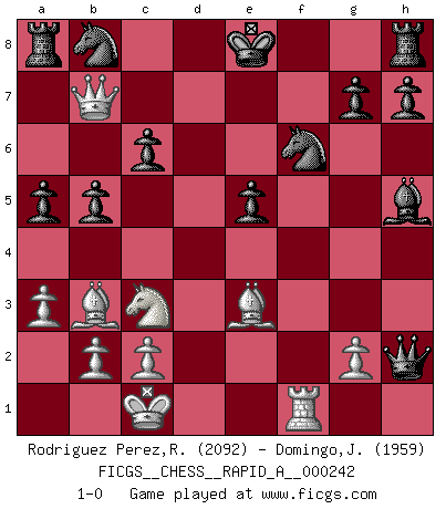 Last move : 1-0 2019 September 25 19:51:17 [Event "FICGS__CHESS__RAPID_A__000242"] [Site "FICGS"] [Date "2019.07.06"] [Round "1"] [White "Rodriguez Perez,Rene"] [Black "Domingo,Jordi"] [Result "1-0"] [WhiteElo "2092"] [BlackElo "1959"] 1.e4 e5 2.Nf3 f5 3.Nxe5 Qf6 4.Nc4 fxe4 5.Nc3 Qe6 6.Ne3 c6 7.d3 Bb4 8.dxe4 Nf6 9.Bc4 Qe5 10.Bd2 b5 11.Bb3 a5 12.a3 Bc5 13.f4 Qxf4 14.Rf1 Qxh2 15.Qf3 d6 16.O-O-O Bxe3 17.Qxe3 Bg4 18.Qb6 Bxd1 19.Qb7 Bh5 20.e5 dxe5 21.Be3 1-0 Latvian counter-gambit Queenside Castling by player White (move 16) Player White won this chess game. Follow this game move after move (download)If your opponent offers you a draw, try to work out why he thinks he's worse off. (Nigel Short) Ohne ihre Erfolge schmälern zu wollen würde ich sagen Petrosian, Spassky und Karpov verdanken ihre Siege ihren Trainern - Boleslavsky, Bondarevsky und Furman. (Mikhail Moiseyevich Botvinik) Yo he agregado estos principios a la ley: pongan los Caballos en acción antes de que los dos Alfiles sean desarrollados. (Emanuel Lasker) Aucun coup ne doit être joué sans but. (Pedro Damiano) However beautiful the strategy, you should occasionally look at the results. (Winston Churchill)