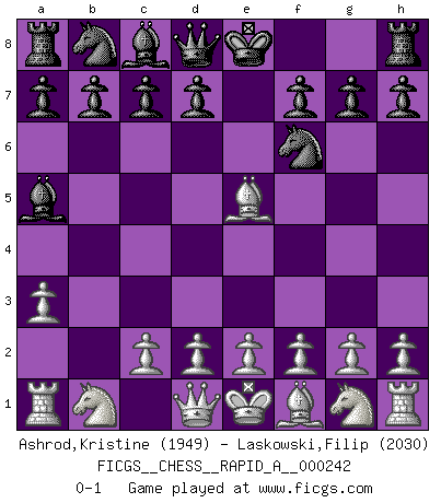 Last move : 0-1 2019 August 21 11:40:44 [Event "FICGS__CHESS__RAPID_A__000242"] [Site "FICGS"] [Date "2019.07.06"] [Round "1"] [White "Ashrod,Kristine"] [Black "Laskowski,Filip"] [Result "0-1"] [WhiteElo "1949"] [BlackElo "2030"] 1.b4 e5 2.Bb2 Bxb4 3.Bxe5 Nf6 4.a3 Ba5 0-1 This chess game has been lost on time (started : 2019.07.06 14:10:20) Polish (Sokolsky) opening Player Black won this chess game. Follow this game move after move (download)Many Chess players were surprised when after the game, Fischer quietly explained: 'I had already analyzed this possibility' in a position which I thought was not possible to foresee from the opening. (Mikhail Tal) Kleine Schachspieler machen Mist, und große Schachspieler machen Mist, aber große machen weniger Mist. (Fritz Sämisch) No hay un Gran Maestro de Ajedrez que sea normal; solo se diferencían ellos por la magnitud de su locura. (Viktor Korchnoi) Vous n'êtes pas toujours obligé de jouer le meilleur coup. Un coup doit être actif, entreprenant, correct et beau ! (David Bronstein) Creativity is allowing yourself to make mistakes. Art is knowing which ones to keep. (Scott Adams)