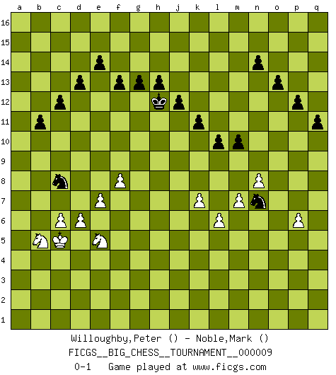 Last move : 0-1 2007 October 7 20:41:22 [Event "FICGS__BIG_CHESS__TOURNAMENT__000009"] [Site "FICGS"] [Date "2007.06.17"] [Round "1"] [White "Willoughby,Peter"] [Black "Noble,Mark"] [Result "0-1"] [WhiteElo ""] [BlackElo ""] 1.j2-k4 h15-g13 2.h2-g4 j15-k13 3.d2-d4 d15-d13 4.n2-n4 c16-k9 5.e2-e4 m15-m13 6.m2-m4 l16-o13 7.f1-d3 e15-e14 8.h1-q9 p16-o14 9.f2-f4 n15-n14 10.g4-f2 f16-c13 11.e4-e5 k13-j11 12.k4-m5 h16-o10 13.d3-k9 o13-k9 14.e1-e2 o10-o2 15.p1-n2 o2-o13 16.f2-d3 g16-j15 17.l1-n3 j15-k13 18.m5-l7 k9-f13 19.n2-l3 b16-d15 20.b1-c3 k16-h15 21.o1-f9 d15-f14 22.c1-e3 o16-m14 23.c3-d5 a16-d16 24.a1-f1 d16-d14 25.q1-o1 o13-l10 26.l3-m5 d14-b14 27.f1-f3 b14-b9 28.d5-e7 c13-a11 29.q9-g9 a11-e7 30.g9-g8 f13-l8 31.g2-g4 f14-g12 32.f9-d7 g12-f10 33.g8-c8 b9-c9 34.c8-j8 l10-j8 35.l7-j8 h15-j13 36.m5-k6 l8-h11 37.d7-h11 g13-h11 38.f4-f5 c9-q9 39.q2-q3 j16-h15 40.f5-f6 e7-a11 41.k1-l3 c15-c14 42.c2-c4 b15-b13 43.m4-m5 a15-a13 44.g1-j2 m16-m15 45.b2-b4 l15-l13 46.e3-g5 g15-g13 47.k6-h7 o14-n12 48.f6-f7 k13-h12 49.g5-a11 k15-k13 50.e5-e6 f15-f13 51.e2-e5 q9-a9 52.a11-e7 l13-l12 53.f3-f2 j13-g12 54.e7-d8 o15-o13 55.e5-a5 a9-a5 56.b4-a5 c14-c13 57.o1-o5 p15-p13 58.f2-f6 q15-q13 59.d3-e5 b13-b12 60.j1-h2 a13-a12 61.f6-p6 p13-p12 62.n3-h8 q16-q15 63.j8-g9 c13-c12 64.g9-h11 f10-h11 65.h7-j9 h11-j9 66.h8-j9 j11-g10 67.j9-k10 a12-a11 68.m1-m4 a11-a10 69.o5-q5 q13-q12 70.n4-n5 q12-q11 71.d8-f6 b12-b11 72.d4-d5 m14-j11 73.k10-g7 j14-j13 74.e6-e7 k13-k12 75.f7-f8 h15-j14 76.p2-p4 g12-f10 77.l3-j4 f10-e8 78.g7-k10 e8-f6 79.k10-j11 f6-g4 80.h3-g4 g10-j11 81.d5-d6 m13-m12 82.j4-g5 m12-m11 83.m4-h4 l12-l11 84.k2-k4 m11-m10 85.l2-l4 m15-m11 86.g5-f7 q15-m15 87.g4-g5 m11-o11 88.l4-l5 m15-m11 89.c4-c5 e16-m16 90.f7-d8 o11-o2 91.m5-m6 m11-o11 92.h2-h3 m16-m11 93.d8-e10 h12-g14 94.e10-d12 g14-f12 95.p6-p9 j11-h13 96.h4-h9 h13-f14 97.h9-e9 f14-e12 98.a2-a4 o2-n2 99.e9-f9 o11-o2 100.j2-g3 n2-a2 101.h3-h4 a2-a4 102.h4-j5 a4-a5 103.e5-d7 o2-g2 104.g3-h5 g2-g5 105.p9-h9 l11-l10 106.q5-q7 m11-d11 107.f9-d9 d11-d9 108.h9-d9 g5-g10 109.j3-j4 g10-d10 110.d9-d10 e12-d10 111.j5-j6 a5-a9 112.h5-g7 d10-f9 113.g7-f9 a9-f9 114.d7-e9 f9-j9 115.q7-j7 j9-j7 116.j6-j7 n12-l11 117.k4-k5 j13-j12 118.e9-g8 k12-k11 119.g8-j9 j14-j13 120.l5-l6 h14-h13 121.n5-n6 a10-a9 122.d12-b13 a9-a8 123.b13-c11 a8-a7 124.c11-b9 a7-a6 125.b9-a7 a6-a5 126.a7-b5 a5-a4 127.j9-h7 l11-k9 128.j7-h6 f12-e10 129.h7-f6 e10-c9 130.c5-c6 k9-h8 131.f6-e4 c9-a8 132.h6-g7 h8-f9 133.g7-f6 a8-b6 134.e4-d2 j13-h12 135.f6-e5 f9-g7 136.e5-d4 g7-f5 137.d4-c5 b6-c8 138.d2-c4 f5-h6 139.c5-b4 h6-j4 140.b4-a4 j4-l3 141.k5-k6 l3-j4 142.k6-k7 j4-l5 143.n6-n7 l5-n4 144.m6-m7 n4-o2 145.a4-b4 o2-q3 146.b4-c5 q3-o2 147.p4-p5 o2-n4 148.p5-p6 n4-p3 149.c4-e5 p3-o5 150.n7-n8 o5-n7 0-1 Follow this game move after move (download)It's just you and your opponent at the board and you're trying to prove something. (Bobby Fischer) Wer sich die Fähigkeit anerziehen will im Schach selbstständig zu denken, der muß alles meiden, was leblos ist: ausgeklügelte Theorien, die sich auf sehr wenige Beispiele und eine Menge Hirngespinste stützen. (Emanuel Lasker) Bobby es la celebridad menos entendida y malinterpretada que camina el la faz de esta tierra. (Yasser Seirawan) Des idées, des idées, j'en ai cent, j'en ai mille. Des bonnes, des mauvaises, applicables, irréalisables... Il suffit de faire le tri ! (Roos) If you lose the game you should win the analysis! (Proverb)
