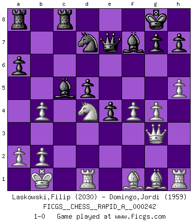 Last move : 1-0 2019 October 31 14:0:53 [Event "FICGS__CHESS__RAPID_A__000242"] [Site "FICGS"] [Date "2019.07.06"] [Round "1"] [White "Laskowski,Filip"] [Black "Domingo,Jordi"] [Result "1-0"] [WhiteElo "2030"] [BlackElo "1959"] 1.e4 e5 2.Nf3 f5 3.Nxe5 Qf6 4.d4 d6 5.Nc4 fxe4 6.Nc3 Qg6 7.Bf4 Nf6 8.Qd2 Be7 9.O-O-O O-O 10.h3 d5 11.Ne5 Qe8 12.Kb1 Be6 13.Qe3 c6 14.f3 Nbd7 15.Bh2 Bb4 16.f4 c5 17.Nxd7 Nxd7 18.Nb5 Qe7 19.g4 Bf7 20.c3 cxd4 21.Nxd4 Bc5 22.Bg1 a6 23.Qg3 b5 24.h4 Rfc8 25.h5 b4 26.cxb4 1-0 Latvian counter-gambit Queenside Castling by player White (move 9) Kingside Castling by player Black (move 9) Player White won this chess game. Follow this game move after move (download)Chess is a foolish expedient for making idle people believe they are doing something very clever when they are only wasting their time. (George Bernard Shaw) Wer wird heute Abend ihr Gegner sein? -- Heute Abend spiele ich gegen die schwarzen Steine. (Akiba Rubinstein) a manera como él juega al Ajedrez, demuestra la completa naturaleza de un hombre. (Stanley Ellin) Assurément je connaissais par expérience le mystérieux attrait de ce jeu royal, le seul entre tous les jeux inventés par les hommes qui échappe souverainement à la tyrannie du hasard, le seul où l'on ne doive sa victoire qu'à son intelligence ou plutôt à une certaine forme d'intelligence. Mais n'est-ce pas déjà le limiter injurieusement que d'appeler les échecs un jeu ? N'est-ce pas une science, un art ou quelque chose qui, comme le cercueil de Mahomet entre ciel et terre, est suspendu entre l'un et l'autre, et qui réunit un nombre incroyable de contraires ? [...] C'est une pensée qui ne mène à rien, une mathématique qui n'établit rien, un art qui ne laisse pas d'uvre, une architecture sans matière; et il l'a prouvé néanmoins qu'il était plus durable, à sa manière, que les livres ou que tout autre monument, ce jeu unique qui appartient à tous les peuples et à tous les temps, et dont personne ne sait quel dieu en fit don à la terre pour tuer l'ennui, pour aiguiser l'esprit et stimuler l'âme. Où commence-t-il, où finit-il ? (Stefan Zweig) Information on the Internet is subject to the same rules and regulations as conversation at a bar. (George Lundberg)