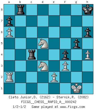 Last move : 1/2-1/2 2019 August 19 15:41:1 [Event "FICGS__CHESS__RAPID_A__000242"] [Site "FICGS"] [Date "2019.07.06"] [Round "1"] [White "Cleto Junior,Dirceu"] [Black "Sternik,Ryszard"] [Result "1/2-1/2"] [WhiteElo "2162"] [BlackElo "2082"] 1.d4 d5 2.c4 c6 3.Nf3 Nf6 4.Nc3 dxc4 5.a4 Bf5 6.Ne5 Nbd7 7.Nxc4 Qc7 8.g3 e5 9.dxe5 Nxe5 10.Bf4 Nfd7 11.Bg2 f6 12.O-O Nc5 13.Ne3 Bg6 14.b4 Ne6 15.a5 Rd8 16.Qb3 Bf7 17.Qa4 Nxf4 18.gxf4 Nd7 19.a6 b5 20.Qc2 Qxf4 21.Bxc6 Bxb4 22.Rad1 O-O 23.Bxd7 Bd6 24.Rxd6 Qxd6 25.Bxb5 Bg6 26.Ne4 Qe5 27.Bd3 Kh8 28.Rb1 Rc8 29.Qb2 Qxb2 30.Rxb2 Rc6 31.f3 f5 32.Nf2 f4 33.Nd5 Bxd3 34.Nxd3 g5 35.h4 h6 36.Ra2 Rb8 37.N5b4 Rc4 38.Nd5 1/2-1/2 QGD Slav : Krause attack Kingside Castling by player White (move 12) Kingside Castling by player Black (move 22) This chess game ended in a draw. Follow this game move after move (download)The blunders are all there on the board, waiting to be made. (Savielly Tartakover) Schach ist die gewalttätigste aller Sportarten. (Garry Kasparov) Si el Ajedrez es una ciencia, es la mas inexacta. Si el Ajedrez es un arte, es demasiado inexacto para ser visto como tal. Si el Ajedrez es un deporte, es demasiado esotérico. Si el Ajedrez es un juego, es demasiado exigente para ser solo un juego. Si el Ajedrez es una aventura, es una muy demandante. Si el Ajedrez es una pasión, es una muy gratificante. Si el Ajedrez es la vida, es una muy triste. (Anónimo) Donnez-moi un Cavalier en 6e et je gagnerais toutes mes parties. (Steinitz) A specialist learns more and more about less and less until he knows everything about nothing. (Nicholas Murray Butler)