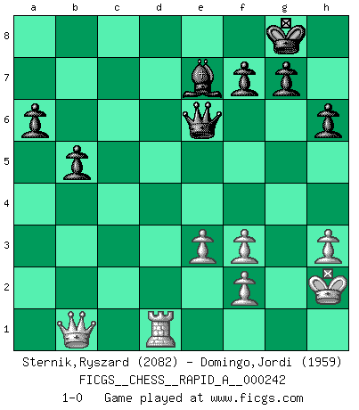 Last move : 1-0 2019 October 31 14:0:41 [Event "FICGS__CHESS__RAPID_A__000242"] [Site "FICGS"] [Date "2019.07.06"] [Round "1"] [White "Sternik,Ryszard"] [Black "Domingo,Jordi"] [Result "1-0"] [WhiteElo "2082"] [BlackElo "1959"] 1.b4 e5 2.Bb2 Bxb4 3.Bxe5 Nf6 4.e3 O-O 5.c4 d5 6.Nf3 Nc6 7.Bb2 Re8 8.cxd5 Nxd5 9.Be2 Bf5 10.a3 Ba5 11.O-O Qd7 12.Nh4 Be6 13.d4 Rad8 14.Nf3 Bf5 15.Nbd2 Nc3 16.Bxc3 Bxc3 17.Ra2 h6 18.Nb1 Ba5 19.Nbd2 a6 20.Qa1 Bb6 21.Nc4 Ba7 22.Rb2 b5 23.Nce5 Nxe5 24.Nxe5 Qd6 25.Bf3 c5 26.Nc6 Bg4 27.dxc5 Bxc5 28.Nxd8 Bxf3 29.gxf3 Rxd8 30.h3 Bxa3 31.R2b1 Rc8 32.Rfd1 Qg6+ 33.Kh1 Bf8 34.Rbc1 Qe6 35.Kh2 Rxc1 36.Qxc1 Be7 37.Qb1 1-0 Polish (Sokolsky) opening Kingside Castling by player Black (move 4) Kingside Castling by player White (move 11) Player White won this chess game. Follow this game move after move (download)Chess is a fighting game which is purely intellectual and includes chance. (Richard Reti) Im Leben werden Partien nie so unstrittig gewonnen wie im Spiel (Emanuel Lasker) Las ideas audaces son como las piezas del Ajedrez que avanzan hacia adelante. Ellas pueden ser vencidas, pero también pueden iniciar una partida victoriosa. (Goethe) Un footballeur joue avec ses pieds, parfois avec sa tête. Un joueur d'échecs ne joue qu'avec sa tête. Et quand il ne joue plus, il meurt. (Jacob Murray) Perhaps the current trend of many chess professionals taking up the more lucrative pastime of poker is not a wholly negative one. It may not be too late for humans to relearn how to take risks in order to innovate and thereby maintain the advanced lifestyles we enjoy. And if it takes a poker-playing supercomputer to remind us that we can't enjoy the rewards without taking the risks, so be it. (The Chess Master and the Computer, by Garry Kasparov - 2010)