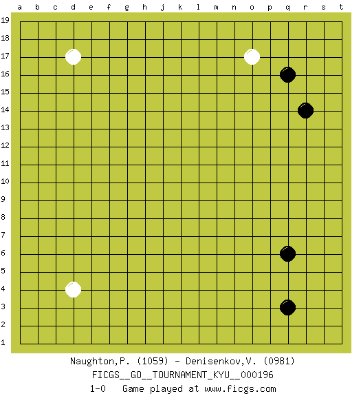 Last move : 1-0 2019 August 14 15:32:16 [Event "FICGS__GO__TOURNAMENT_KYU__000196"] [Site "FICGS"] [Date "2019.07.07"] [Round "1"] [Black "Naughton,Patrick"] [White "Denisenkov,Valentin"] [Result "1-0"] [Rating 1 "1059"] [Rating 2 "0981"] 1.q16 d4 2.q3 d17 3.q6 o17 4.r14 1-0 This go game has been lost on time (started : 2019.07.07 0:28:22) Here are the names of the openings (joseki) played in the four corners : Corner q16 : q16 o17 Hoshi (Hwajeom, Seongjeom, Xingwei`) 4-4 Point. The star or hoshi (4-4) point, emphasizing influence at the potential expense of territory. Ikken Kakari (Hankan Keolch'im, Yi Gua`jiao~, 1-Space Low Approach). White 2 is the standard approach move to the 4-4. Player Black won this Go (weiqi, baduk) game. Follow this game move after move (download)In the corner, five stones in a row on the third line are alive. (Anonymous) Macintosh - we might not get everything right, but at least we knew the century was going to end. (Douglas Adams)