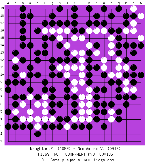 Last move : 1-0 2019 September 29 20:7:37 [Event "FICGS__GO__TOURNAMENT_KYU__000196"] [Site "FICGS"] [Date "2019.07.07"] [Round "1"] [Black "Naughton,Patrick"] [White "Nemchenko,Valery"] [Result "1-0"] [Rating 1 "1059"] [Rating 2 "0913"] 1.q16 d4 2.q4 d16 3.f3 f4 4.g3 g4 5.h4 h5 6.j4 j5 7.k5 k4 8.k3 l4 9.l3 j3 10.h3 l5 11.k6 l6 12.k7 l7 13.g5 j6 14.j7 h7 15.h6 k8 16.j8 k9 17.q7 h8 18.j9 h9 19.d10 j10 20.h10 h11 21.g10 g9 22.f9 f10 23.g11 f11 24.g12 e9 25.f8 f7 26.g7 e8 27.g8 f6 28.e10 f12 29.f13 g13 30.h12 j11 31.e13 e11 32.d11 d9 33.k16 h13 34.f17 f16 35.g17 g16 36.h17 h16 37.n17 j16 38.j17 k15 39.l16 l15 40.q13 p14 41.q14 p15 42.p16 o16 43.o17 n16 44.o3 f5 45.c3 c4 46.d3 e3 47.e2 e4 48.c9 c8 49.b9 b8 50.b11 c10 51.b10 d12 52.e12 d13 53.d14 e14 54.c14 d15 55.c17 d17 56.c16 e17 57.j12 k11 58.k12 l12 59.r10 q10 60.o8 o9 61.p9 p10 62.q9 r11 63.s10 r9 64.s9 p13 65.o5 n9 66.n8 m8 67.c15 q12 68.s13 r13 69.r14 s12 70.s14 t13 71.q15 m16 72.m17 l17 73.k17 l18 74.k18 m18 75.n18 n19 76.m19 l19 77.k19 p17 78.m19 o18 79.p18 q17 80.r17 q18 81.o19 r16 82.r18 s16 83.t14 t12 84.s11 r8 85.r7 p8 86.q8 p7 87.p6 o7 88.n7 t11 89.r12 q11 90.t10 q6 91.r6 m7 92.n6 m6 93.n4 m4 94.m3 m5 95.m9 l9 96.m10 n10 97.m11 l11 98.m12 l13 99.n11 o11 100.o10 o12 101.b4 b5 102.b3 a4 103.a3 a5 104.g6 l10 105.m13 m14 106.a8 a7 107.a9 p5 108.o6 k13 109.f14 e15 110.j13 j14 111.h14 g14 112.g15 h15 113.n14 n13 114.b7 a6 115.e7 d7 116.d8 e6 117.c7 c6 118.d6 d5 119.b6 d7 120.c5 b5 121.a5 c13 122.b13 b12 123.c12 f18 124.g18 e19 125.d18 e18 126.c18 d19 127.c19 g19 128.h19 f19 129.f15 s17 130.s18 t18 131.q19 s19 132.e16 p4 133.q5 s8 134.s7 t15 135.n5 1-0 Here are the names of the openings (joseki) played in the four corners : Corner d4 : d4 f3 Hoshi (Hwajeom, Seongjeom, Xingwei`) 4-4 Point. The star or hoshi (4-4) point, emphasizing influence at the potential expense of territory. Ikken Kakari (Hankan Keolch'im, Yi Gua`jiao~, 1-Space Low Approach). Black 2 is the standard approach move to the 4-4. Corner q4 : q4 l4 Hoshi (Hwajeom, Seongjeom, Xingwei`) 4-4 Point. The star or hoshi (4-4) point, emphasizing influence at the potential expense of territory. Player Black won this Go (weiqi, baduk) game. Follow this game move after move (download)Don't make dango's. (Anonymous) I believe in luck. How else can you explain the success of those you dislike ? (Jean Cocteau)