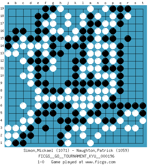 Last move : 1-0 2019 August 15 11:20:58 [Event "FICGS__GO__TOURNAMENT_KYU__000196"] [Site "FICGS"] [Date "2019.07.07"] [Round "1"] [Black "Simon,Mickael"] [White "Naughton,Patrick"] [Result "1-0"] [Rating 1 "1071"] [Rating 2 "1059"] 1.q17 d4 2.c16 q4 3.r15 k16 4.e16 g17 5.e17 o17 6.f3 c6 7.d2 c3 8.j3 c10 9.r6 n4 10.q10 r5 11.q6 c14 12.m17 n16 13.m16 n15 14.m15 m14 15.l15 k15 16.l14 m13 17.k14 h14 18.k12 p14 19.q13 p13 20.q12 n11 21.j14 j15 22.h15 h16 23.g15 j17 24.g13 f14 25.g14 l17 26.n9 l11 27.k11 l10 28.l8 f13 29.f5 f7 30.e10 d11 31.f12 e12 32.f11 d9 33.e9 e8 34.f8 e7 35.g8 g7 36.h8 l3 37.c2 b2 38.j9 l6 39.s6 s5 40.t5 t4 41.t6 s3 42.k2 l2 43.b15 b14 44.l1 m1 45.k1 n2 46.m18 l18 47.n6 o8 48.o9 p8 49.q8 p9 50.q9 p10 51.p11 o10 52.o12 n13 53.o13 o14 54.d3 c4 55.p7 o7 56.o6 n8 57.m9 m8 58.l9 m7 59.p4 p3 60.m5 l5 61.l4 m4 62.k4 k3 63.h4 j2 64.h2 j1 65.p16 j5 66.j4 h7 67.j6 h5 68.h6 j7 69.g5 k6 70.g6 k7 71.k5 p17 72.q18 p18 73.o4 o3 74.q5 r3 75.f18 g18 76.a14 a13 77.a15 b13 78.d12 c12 79.e13 e14 80.e11 k9 81.k8 j8 82.k10 n10 83.h1 c15 84.b16 f15 85.f16 d13 86.e12 g16 87.d15 d14 88.b1 b3 89.e4 e6 90.q14 p12 91.o11 n12 92.q11 n7 93.n5 d10 94.g19 h19 95.f19 g12 96.h13 g11 97.f9 q19 98.r19 r18 99.p19 o19 100.q19 n18 101.n17 o16 102.p15 j18 103.e5 d5 104.l12 m12 105.m10 m11 106.l13 m19 107.e15 f17 108.e18 m6 109.p6 l7 110.k9 pass 111.o15 n14 112.a2 a3 113.c1 a1 114.l16 a2 115.f6 pass 116.pass 1-0 Here are the names of the openings (joseki) played in the four corners : Corner d4 : d4 f3 Hoshi (Hwajeom, Seongjeom, Xingwei`) 4-4 Point. The star or hoshi (4-4) point, emphasizing influence at the potential expense of territory. Ikken Kakari (Hankan Keolch'im, Yi Gua`jiao~, 1-Space Low Approach). Black 2 is the standard approach move to the 4-4. Corner q4 : q4 r6 Hoshi (Hwajeom, Seongjeom, Xingwei`) 4-4 Point. The star or hoshi (4-4) point, emphasizing influence at the potential expense of territory. Ikken Kakari (Hankan Keolch'im, Yi Gua`jiao~, 1-Space Low Approach). Black 2 is the standard approach move to the 4-4. Player Black won this Go (weiqi, baduk) game. Follow this game move after move (download)Corner, side, centre. (Anonymous) The only thing that matters is the evidence. (Horatio Caine, C.S.I. Miami)