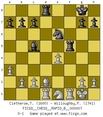 Last move : 0-1 2006 July 4 23:49:49 [Event "FICGS__CHESS__RAPID_B__000007"] [Site "FICGS"] [Date "2006.06.14"] [Round "1"] [White "Cletheroe,Timothy"] [Black "Willoughby,Peter"] [Result "0-1"] [WhiteElo "1600"] [BlackElo "1741"] 1.Nc3 d5 2.e4 dxe4 3.Nxe4 e5 4.Bc4 Nc6 5.Nf3 Be7 6.O-O f5 7.Nc3 e4 8.Ne1 Nf6 9.a3 Nd4 10.d3 Be6 11.Bxe6 Nxe6 12.Bd2 O-O 13.dxe4 Nxe4 14.Nxe4 fxe4 15.Qg4 Qd5 16.Rd1 Rad8 17.f3 Qf5 18.Qxf5 Rxf5 19.fxe4 Bc5+ 0-1 Dunst (Sleipner, Heinrichsen) Opening Kingside Castling by player White (move 6) Kingside Castling by player Black (move 12) Player Black won this chess game. Follow this game move after move (download)Whoever sees no other aim in the game than that of giving checkmate to one's opponent will never become a good Chess player. (Euwe) Wenn ich Weiß habe gewinne ich weil ich Weiß habe, wenn ich Schwarz habe gewinne ich weil ich Bogoljubov bin. (Efim Bogoljubov) Si el ingenio solamente fuese necesario para lucirse, las mujeres serían las mejores jugadoras de Ajedrez del mundo. (Albin) Echiquier : carré parfait, comme la Jérusalem nouvelle décrite par l'auteur de l'Apocalypse, huit cases sur huit, exaltation du chiffre 4, symbole du cosmos aux quatre horizons... où le noir et le blanc, l'ombre et la lumière, le mal et le bien s'entremêlent et se conjuguent. (Robert Couffignal, Le Gambit du poète) 'preceded by its own quotation yields a falsehood' preceded by its own quotation yields a falsehood. (W. V. O. Quine - Set Theory And Its Logic, 1953)