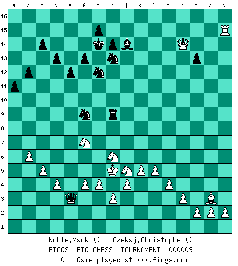 Last move : 1-0 2007 December 24 19:52:21 [Event "FICGS__BIG_CHESS__TOURNAMENT__000009"] [Site "FICGS"] [Date "2007.06.17"] [Round "1"] [White "Noble,Mark"] [Black "Czekaj,Christophe"] [Result "1-0"] [WhiteElo ""] [BlackElo ""] 1.j2-k4 p16-o14 2.h1-o7 j15-h13 3.o7-c7 h15-j13 4.h2-g4 c15-c14 5.p1-o3 d15-d13 6.d2-d4 e15-e13 7.c1-h6 k16-l14 8.m2-m4 n15-n13 9.l1-o4 c16-h11 10.e2-e3 b16-d15 11.f1-c4 m15-m13 12.n2-n3 f15-f13 13.o1-g8 h16-p9 14.o4-p3 g16-f14 15.k1-h2 o16-k12 16.b1-d2 l16-p12 17.a2-a4 f16-c13 18.g1-j2 f14-g12 19.a4-a5 c13-f10 20.c7-f7 d15-f14 21.a5-a6 e16-e14 22.a6-a7 e13-e12 23.d2-f3 g12-h10 24.f7-f10 f14-g12 25.f10-b10 b15-b13 26.a7-a8 a15-a13 27.a8-a9 a13-a12 28.a9-a10 e14-g14 29.a1-a9 p9-m12 30.e1-a1 h11-l8 31.g8-h7 j16-h15 32.a1-a8 l8-h11 33.j2-h4 a12-a11 34.b10-b12 a16-a12 35.b12-b3 k12-m10 36.h2-j4 m10-h6 37.g4-h6 m16-a16 38.f3-g5 o14-n12 39.c4-m13 o15-o13 40.f2-f4 l14-k12 41.m13-c4 q16-m16 42.j1-h2 m16-m14 43.g2-g4 m14-l14 44.l2-l4 a12-d12 45.m1-e1 a16-a12 46.o3-n5 a12-b12 47.a9-b9 b12-b9 48.b3-b9 m12-g7 49.k4-j6 g7-c11 50.b2-b3 g12-e11 51.k2-k4 l14-l8 52.e1-a1 g14-g10 53.a1-a7 l8-a8 54.a7-a8 j13-g12 55.q1-a1 d12-d9 56.b9-f5 g10-f10 57.f5-d3 n12-m14 58.l4-l5 k12-j10 59.j4-k6 j10-g9 60.h7-g6 d9-d10 61.h6-f7 g9-f7 62.c4-f7 p15-p14 63.c2-c4 p12-m9 64.b3-b4 m9-j12 65.b4-b5 h10-f9 66.b5-b6 f9-d8 67.c4-c5 d8-f7 68.g5-f7 h11-e8 69.j6-g5 c11-d11 70.h2-g3 e8-d7 71.k4-k5 b13-b12 72.f7-e9 d11-d12 73.e9-d7 d10-d7 74.a8-l8 l15-l14 75.a1-a8 d7-d10 76.a8-k8 d10-a10 77.l8-m8 m14-k13 78.m8-m15 h15-g14 79.m15-k15 a10-a9 80.k15-q15 f10-a10 81.k8-p8 a9-a3 82.d3-e4 d12-d10 83.p8-p14 d10-n1 84.h4-g2 a3-a1 85.n5-l4 a10-a2 86.g3-h4 n1-n2 87.p14-l14 j12-o7 88.l4-m6 o7-h1 89.l14-j14 a2-g2 90.e4-e8 g2-a2 91.e8-k13 a2-a10 92.k6-j8 n2-f2 93.h4-h5 h1-k3 94.j3-j4 a1-a9 95.m6-k7 a9-h9 96.j8-h6 a10-h10 97.g5-f7 e11-f9 98.k13-n13 f2-e3 99.k7-j5 k3-p8 100.g6-j8 p8-j14 101.j8-h9 h10-h9 102.n13-n14 1-0 Follow this game move after move (download)Any material change in a position must come about by mate, a capture, or a Pawn promotion. (Purdy) Ich würde die 30 stärksten Spieler der USA im Simultanspiel besiegen. (José Raúl Capablanca) Un mal plan es mejor que no tener ningún plan. (Frank Marshall) Ce qui est bien, c'est d'avoir tout un tas de pièces en prise : l'adversaire ne peut en prendre qu'une à la fois. Cité par Thierry Audin. Hello Thibault, if I have had a plan (and I had one, I hope), I have forgotten it during the last week... - Hello Heinz-Georg. What do you mean a plan ? (Anonymous players, during a Big Chess game)