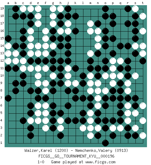 Last move : 1-0 2019 October 29 19:14:24 [Event "FICGS__GO__TOURNAMENT_KYU__000196"] [Site "FICGS"] [Date "2019.07.07"] [Round "1"] [Black "Walzer,Karel"] [White "Nemchenko,Valery"] [Result "1-0"] [Rating 1 "1200"] [Rating 2 "0913"] 1.d3 q16 2.q4 d16 3.d5 f6 4.c9 e10 5.c14 d14 6.c16 d15 7.c15 c12 8.d17 e17 9.d18 e18 10.g16 f16 11.g15 f15 12.k16 g17 13.h17 g18 14.h18 h19 15.j19 g19 16.k18 h16 17.h15 j16 18.j15 j17 19.j18 g14 20.h12 h14 21.j14 h13 22.j13 g12 23.f14 f13 24.g13 e14 25.f12 g14 26.g11 f11 27.e12 e11 28.d12 d11 29.c13 b12 30.c10 c11 31.e8 e9 32.d8 f8 33.g9 f9 34.g8 g7 35.e7 h8 36.h9 g10 37.h10 d13 38.f7 h6 39.k4 e6 40.d6 e5 41.g5 j9 42.j8 h7 43.k8 j10 44.h11 j11 45.j12 e13 46.g12 d19 47.c18 c19 48.b19 e19 49.b18 b10 50.b9 a9 51.b8 a8 52.a7 a10 53.a11 a12 54.b11 b13 55.b14 a14 56.a15 a13 57.k11 k9 58.l9 j7 59.g6 f5 60.h5 j5 61.k7 k6 62.j4 h4 63.g4 f4 64.g3 h3 65.h2 k5 66.l5 l6 67.j6 m5 68.l4 m4 69.m6 n6 70.m7 n7 71.q7 m8 72.l7 m9 73.o16 n16 74.o15 n15 75.o14 n14 76.q14 q15 77.r14 r15 78.p17 q17 79.n17 m16 80.q11 m17 81.n13 m13 82.m12 o13 83.p13 n12 84.m11 n11 85.n10 m10 86.l10 o10 87.o4 m3 88.n5 o5 89.n4 n3 90.o3 o2 91.p2 p3 92.p4 q3 93.n2 m2 94.o1 l3 95.r3 p16 96.p18 q18 97.o6 p5 98.o7 o8 99.p8 p9 100.q9 q10 101.r10 p10 102.r11 p11 103.o12 p12 104.n13 n8 105.o11 n9 106.n11 q12 107.r12 s14 108.s13 t13 109.s15 t14 110.s16 r16 111.s17 p19 112.o19 q19 113.o18 t18 114.s18 s19 115.t12 r4 116.q5 p6 117.p7 r9 118.q8 r8 119.r7 r5 120.q6 r6 121.s6 s5 122.s4 s3 123.r2 t4 124.s7 t6 125.s2 t2 126.p15 r18 127.r17 t16 128.r19 s10 129.h14 f14 130.pass d4 131.c4 e4 132.d2 f3 133.pass 1-0 Here are the names of the openings (joseki) played in the four corners : Corner d16 : d16 c14 Hoshi (Hwajeom, Seongjeom, Xingwei`) 4-4 Point. The star or hoshi (4-4) point, emphasizing influence at the potential expense of territory. Ikken Kakari (Hankan Keolch'im, Yi Gua`jiao~, 1-Space Low Approach). Black 2 is the standard approach move to the 4-4. Corner q16 : q16 o16 Hoshi (Hwajeom, Seongjeom, Xingwei`) 4-4 Point. The star or hoshi (4-4) point, emphasizing influence at the potential expense of territory. Ikken Takagakari (Hankan Nop'dakeolch'im, Yi Gaojia, 1-Space High Approach). White typically responds at 6-4 or 3-10. White 4-10 is played when White finds play on the right side advantageous. White 4-8 or 3-8 may be played when White has support at top. Player Black won this Go (weiqi, baduk) game. Follow this game move after move (download)Territory really exists only in the end. (Pierre Audouard) The leaves of memory seemed to make a mournful rustling in the dark. (Henry Wadsworth Longfellow)